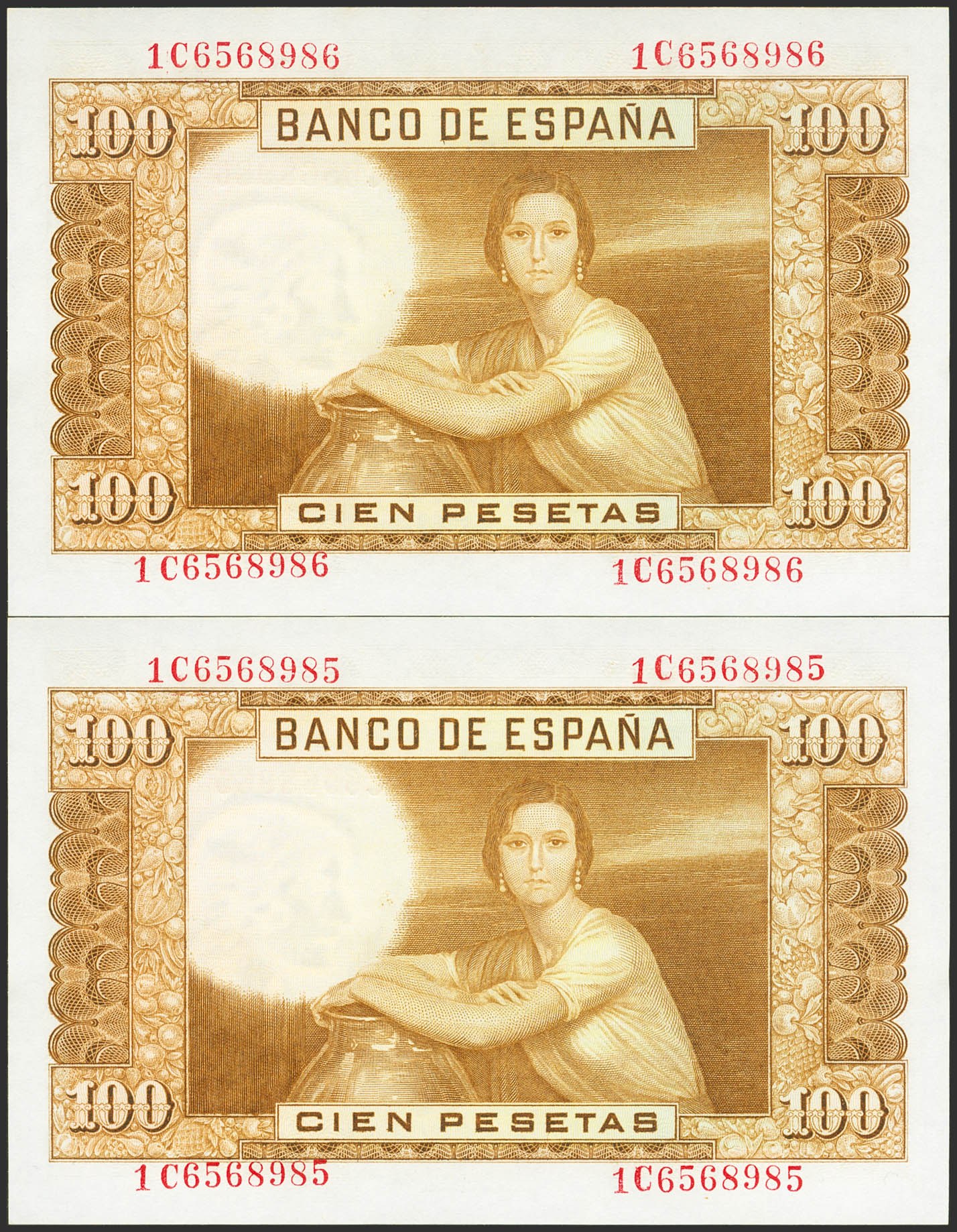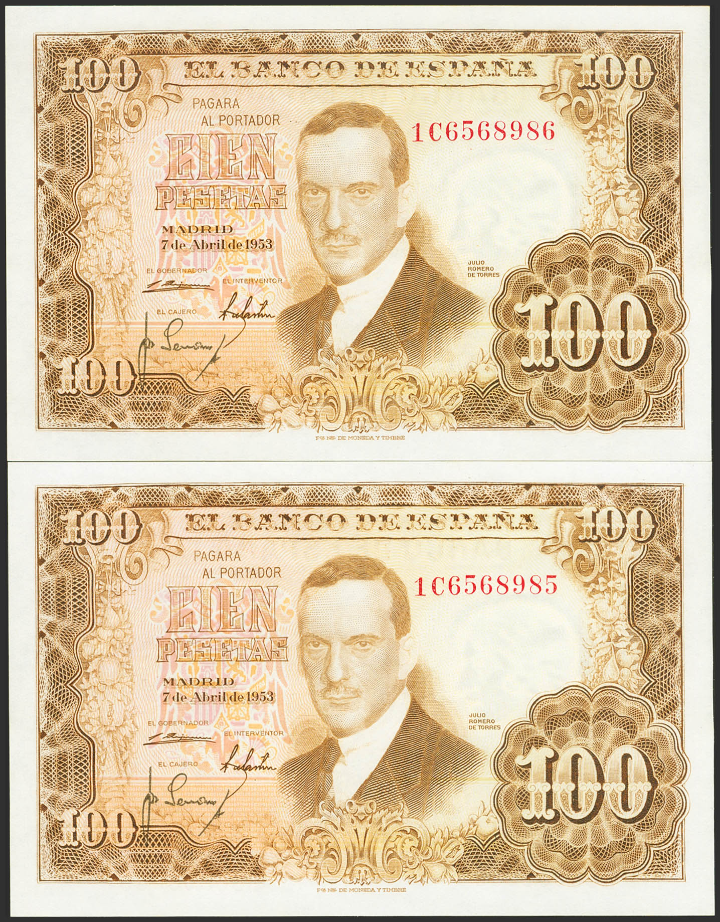 100 Pesetas. 7 de Abril de 1953. Pareja correlativa. Serie 1C. (Edifil 2023: 464c). Apresto original. SC.