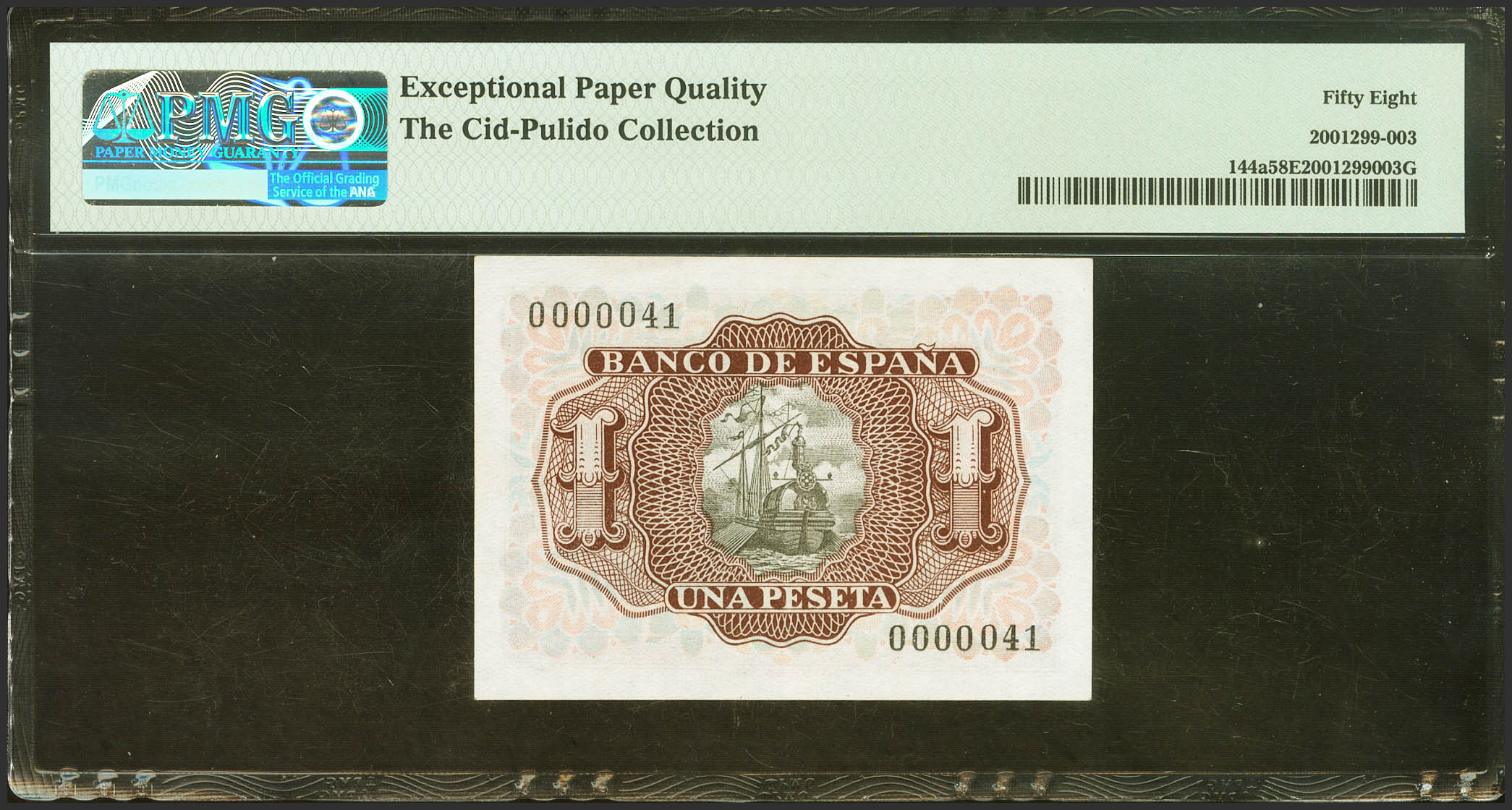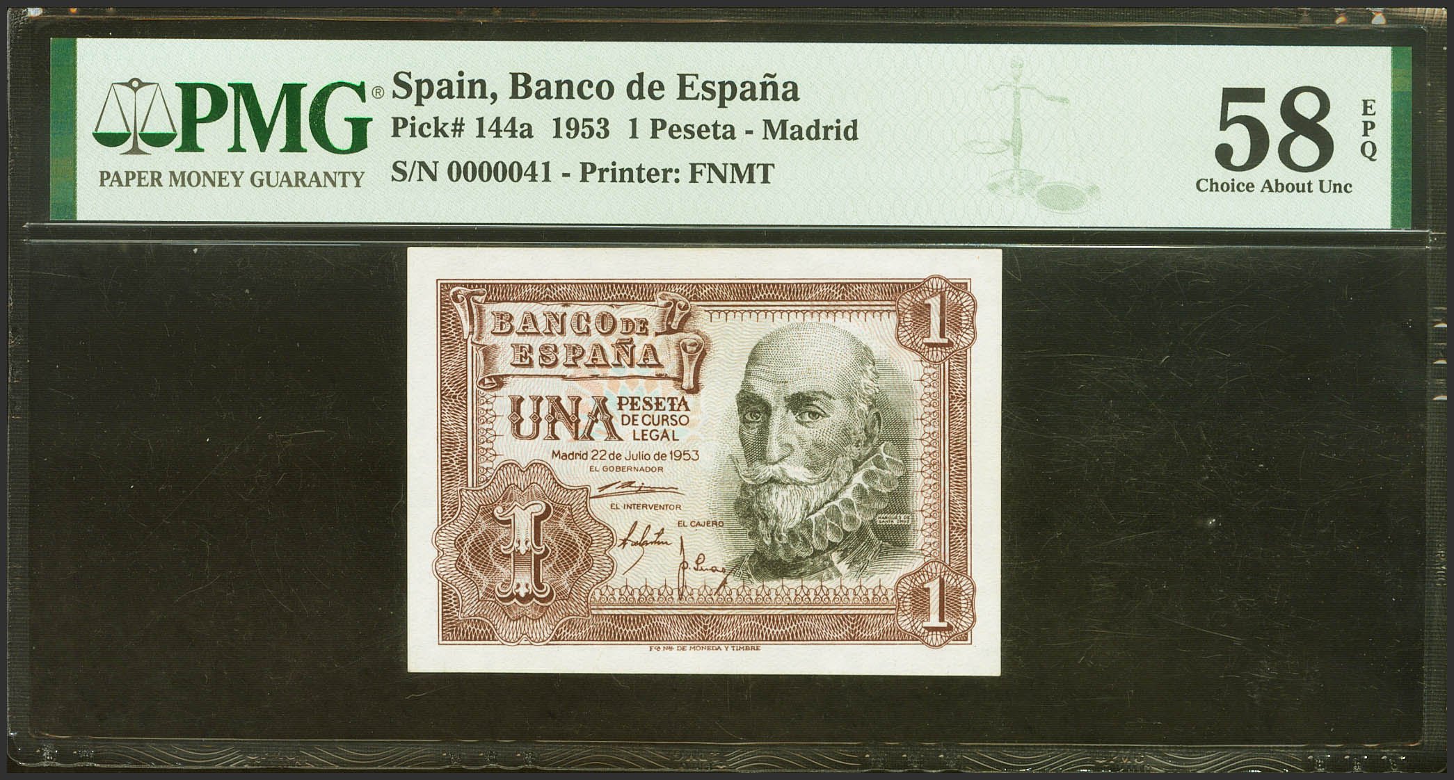 1 Peseta. 22 de Julio de 1953. Sin serie y numeración bajísima (Nº0000041). (Edifil 2021: 465, Pick: 144a). Rarísimo con esta numeración, apresto original. SC. Encapsulado PMG58EPQ. (The Cid-Pulido Collection).
