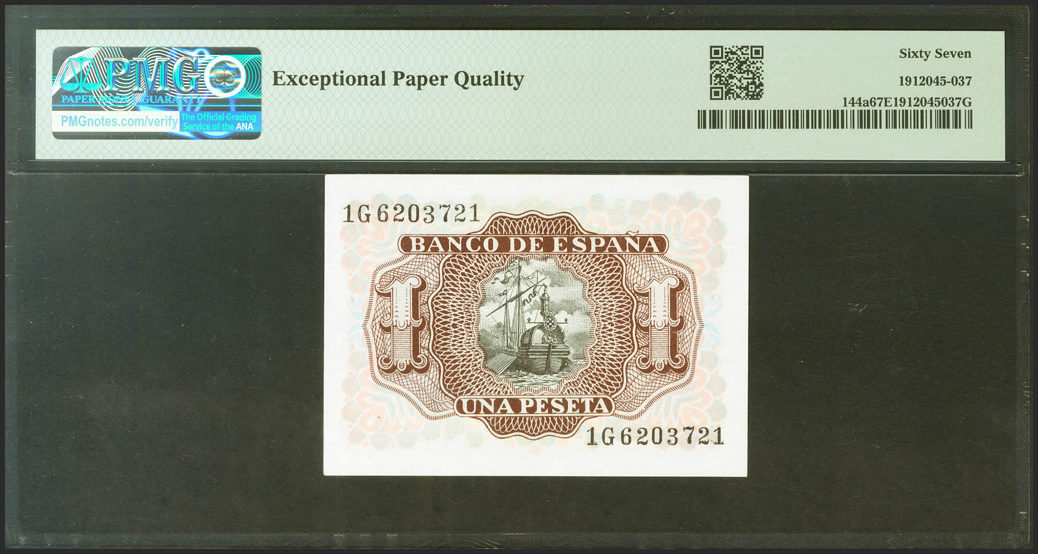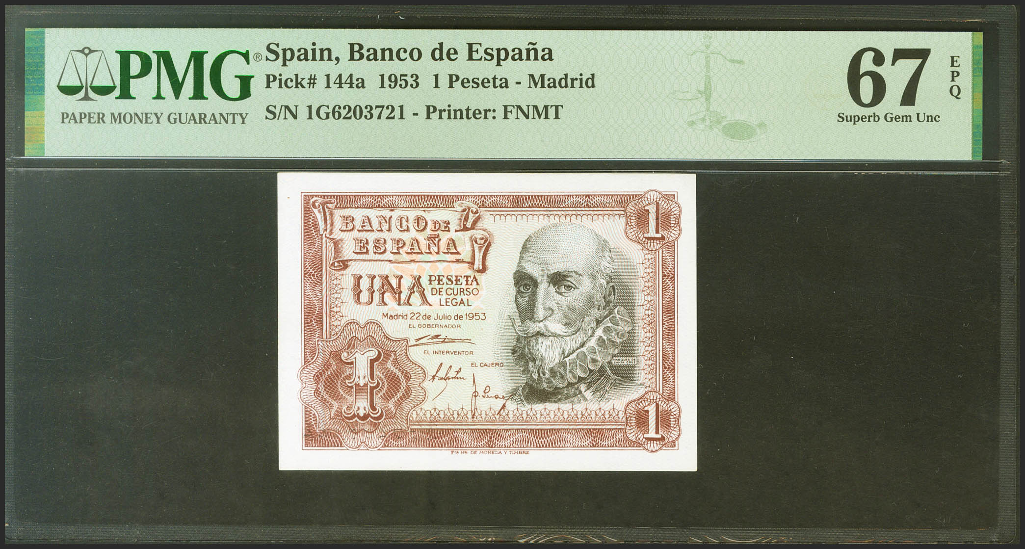 1 Peseta. 22 de Julio de 1953. Serie 1G. (Edifil 2021: 465a, Pick: 144a). Raro en esta excepcional calidad, apresto original. SC. Encapsulado PMG67EPQ.