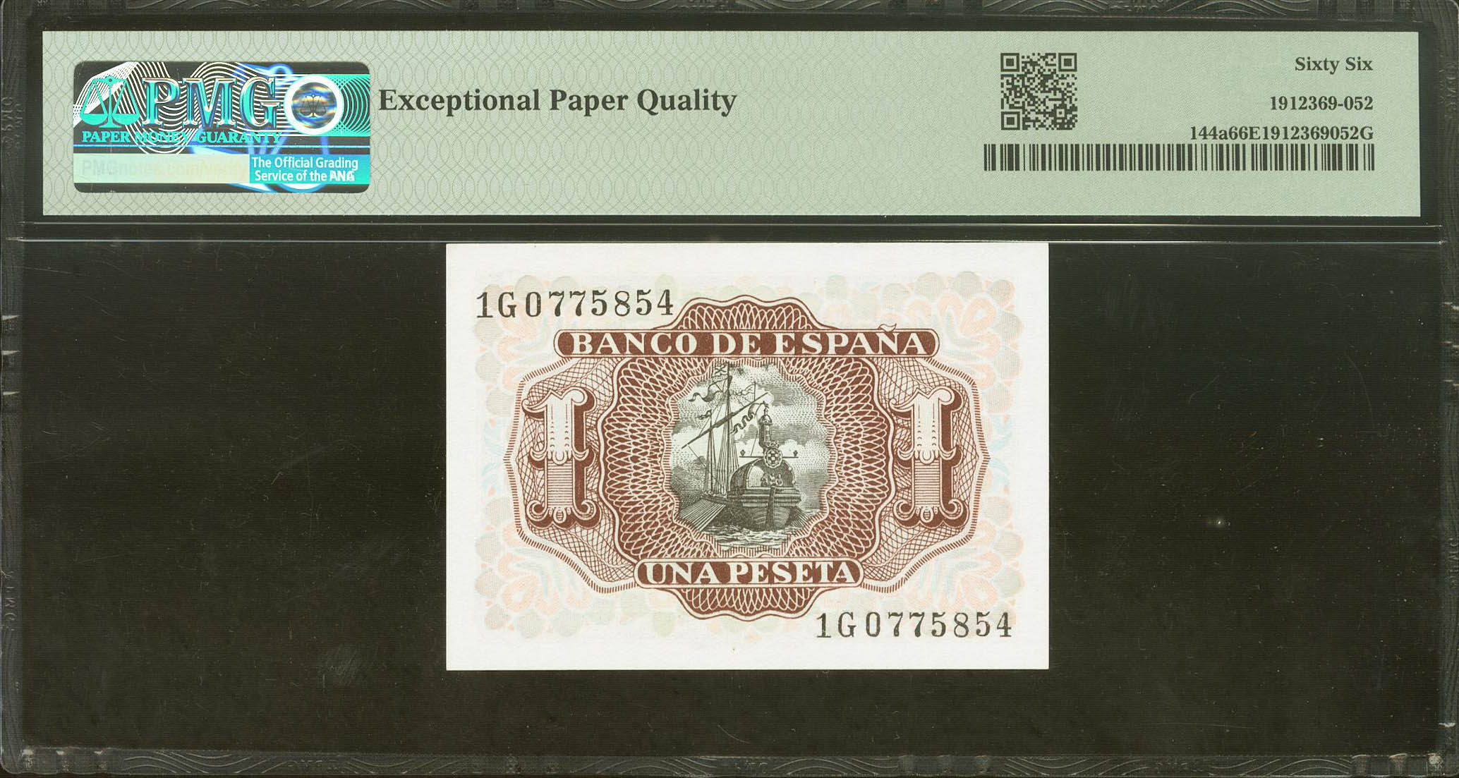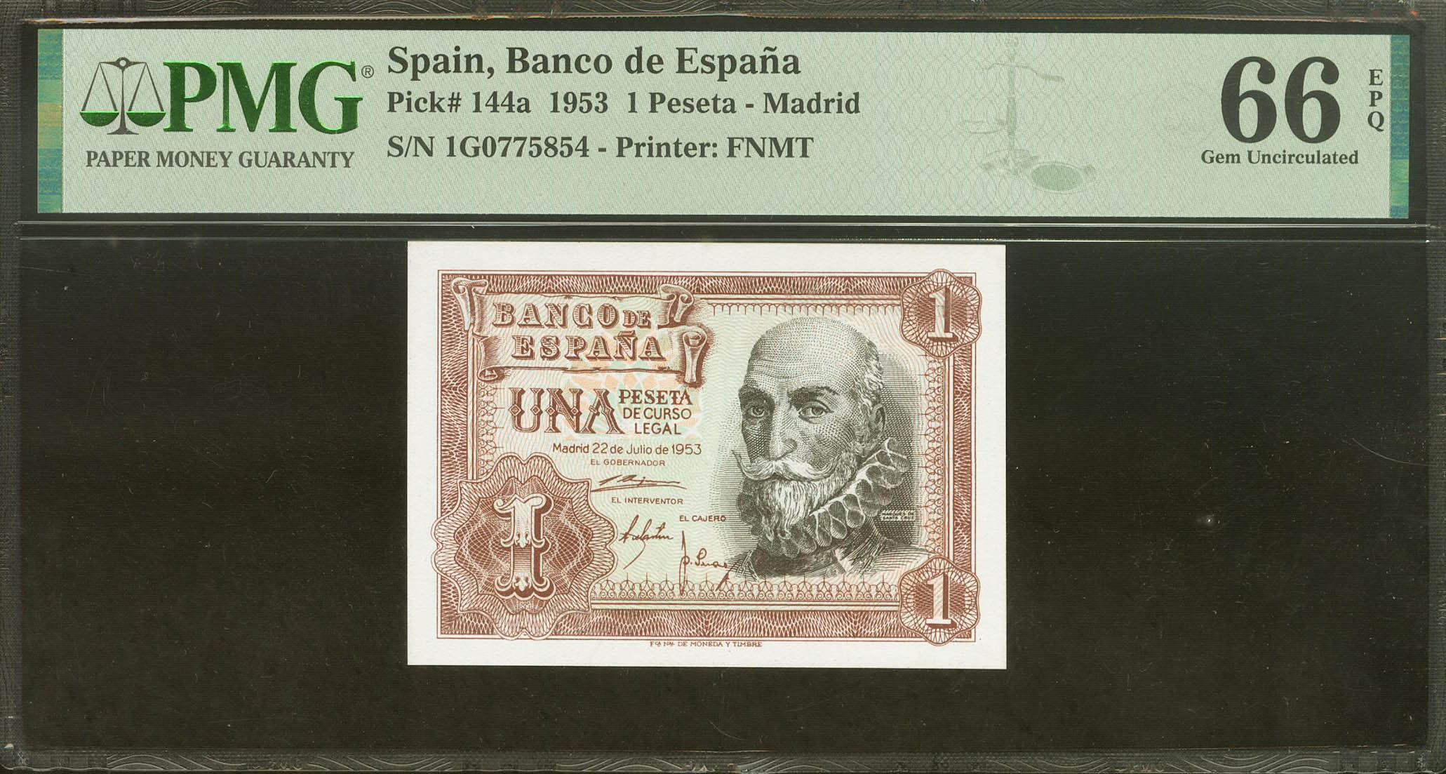 1 Peseta. 22 de Julio de 1953. Serie 1G. (Edifil 2021: 465a, Pick: 144a). Apresto original. SC. Encapsulado PMG66EPQ.