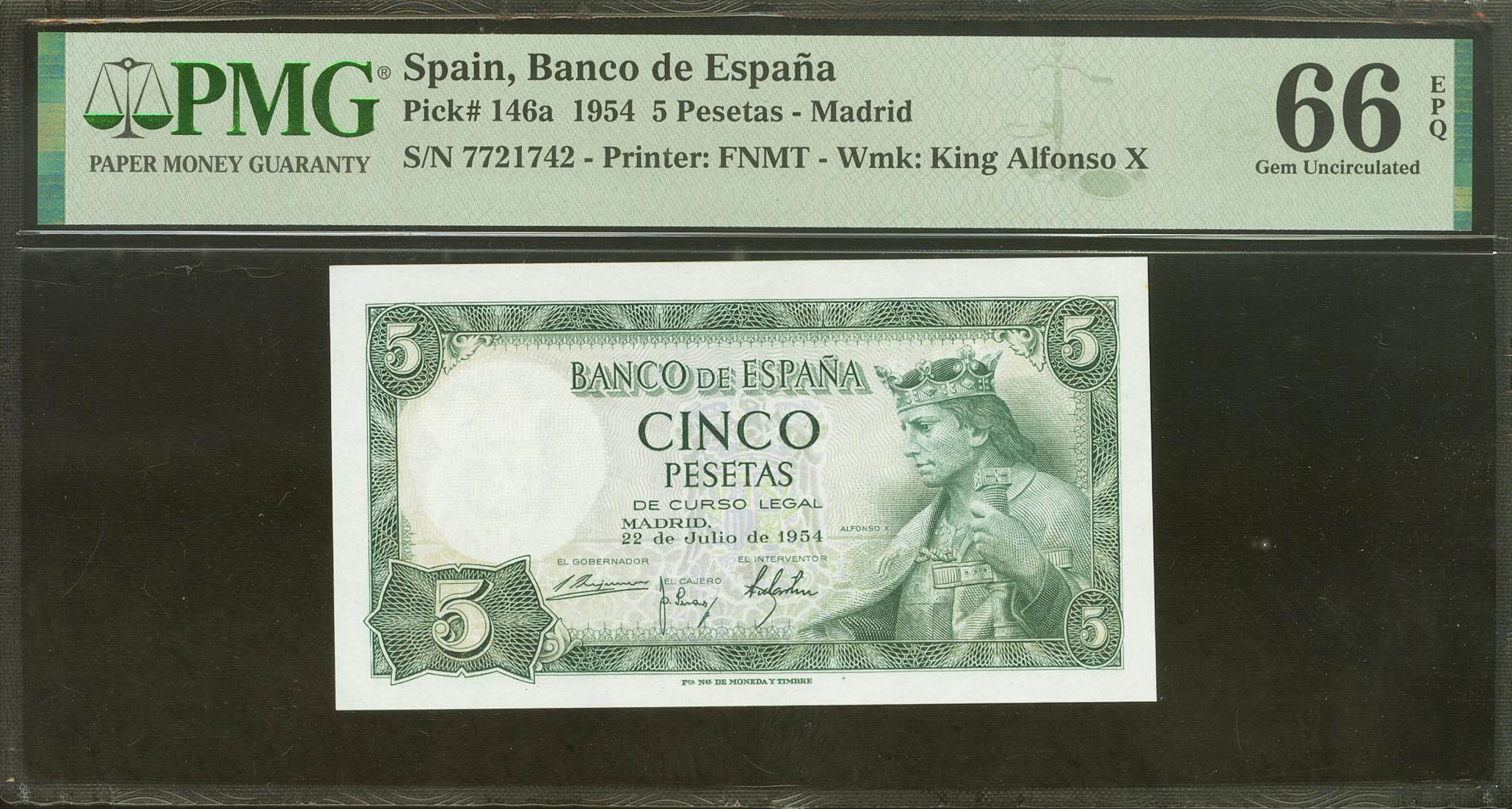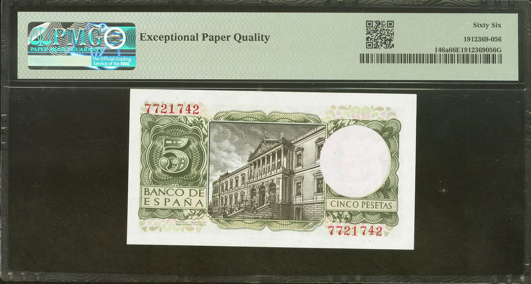5 Pesetas. 22 de Julio de 1954. Sin serie. (Edifil 2021: 466, Pick: 146a). Raro en esta calidad, apresto original. SC. Encapsulado PMG66EPQ.