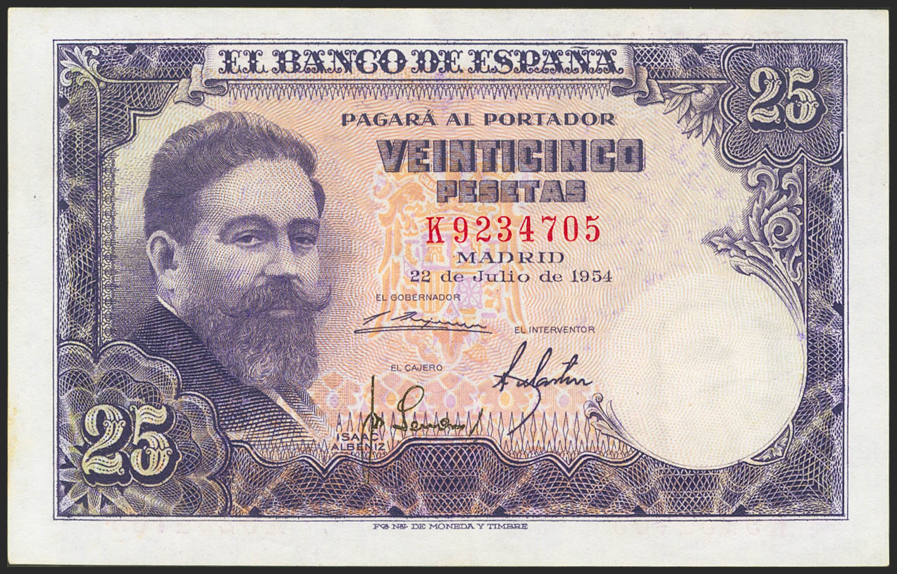 25 Pesetas. 22 de Julio de 1954. Serie K. (Edifil 2021: 467a). Conserva todo su apresto original. EBC.