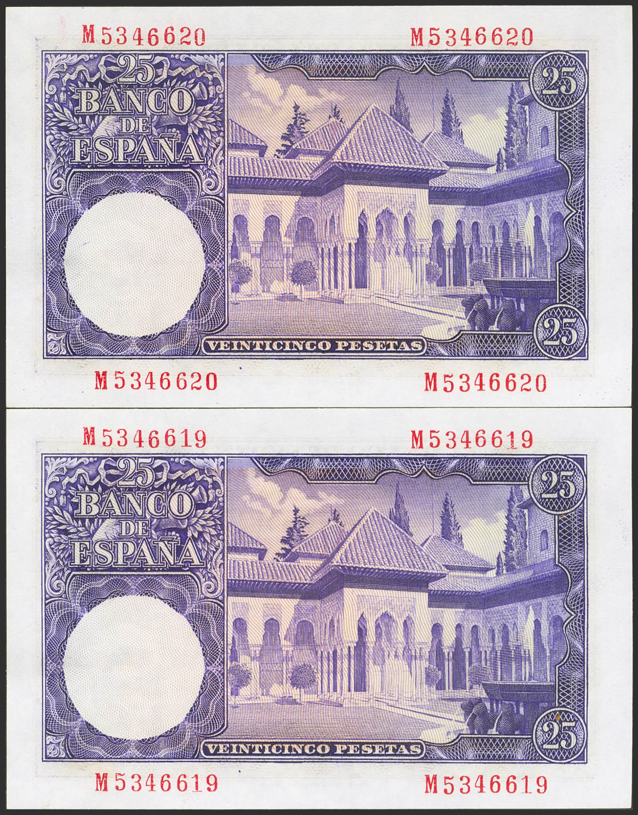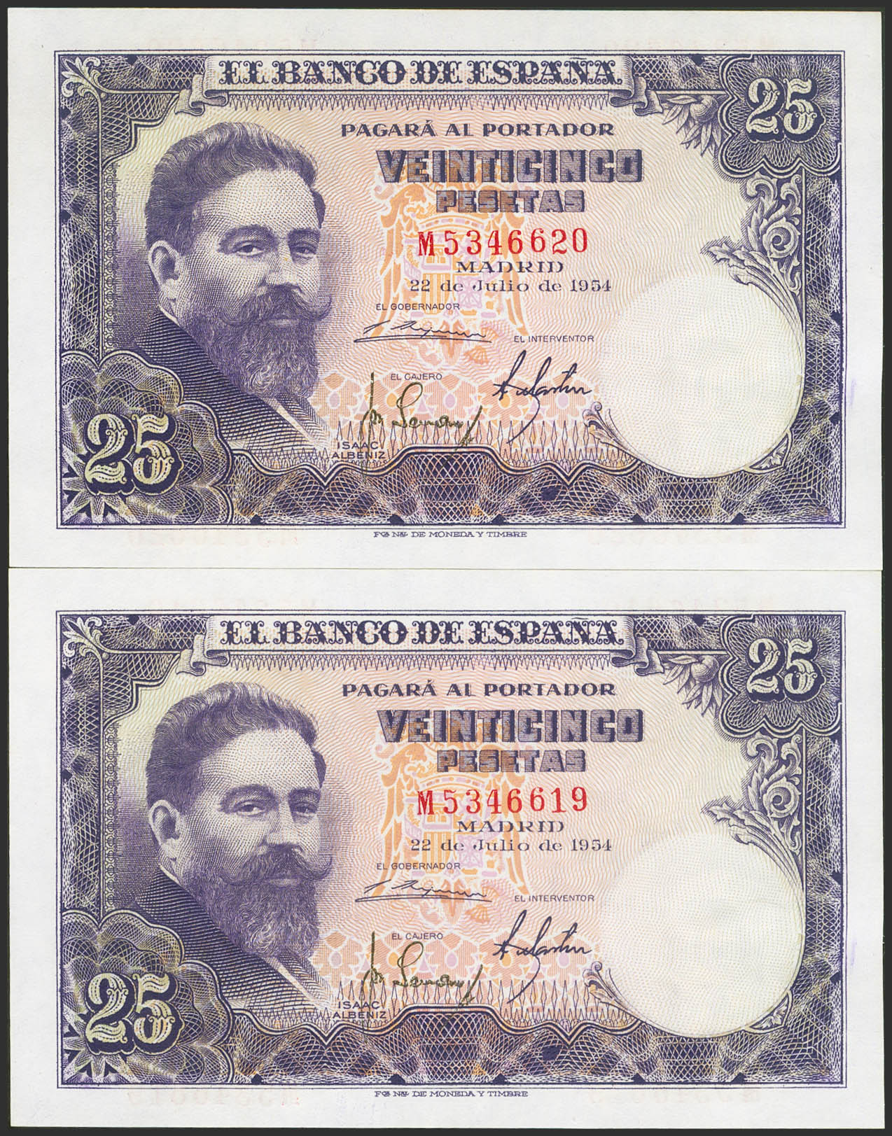 25 Pesetas. 22 de Julio de 1954. Pareja correlativa. Serie M. (Edifil 2021: 467a). Apresto original. SC.