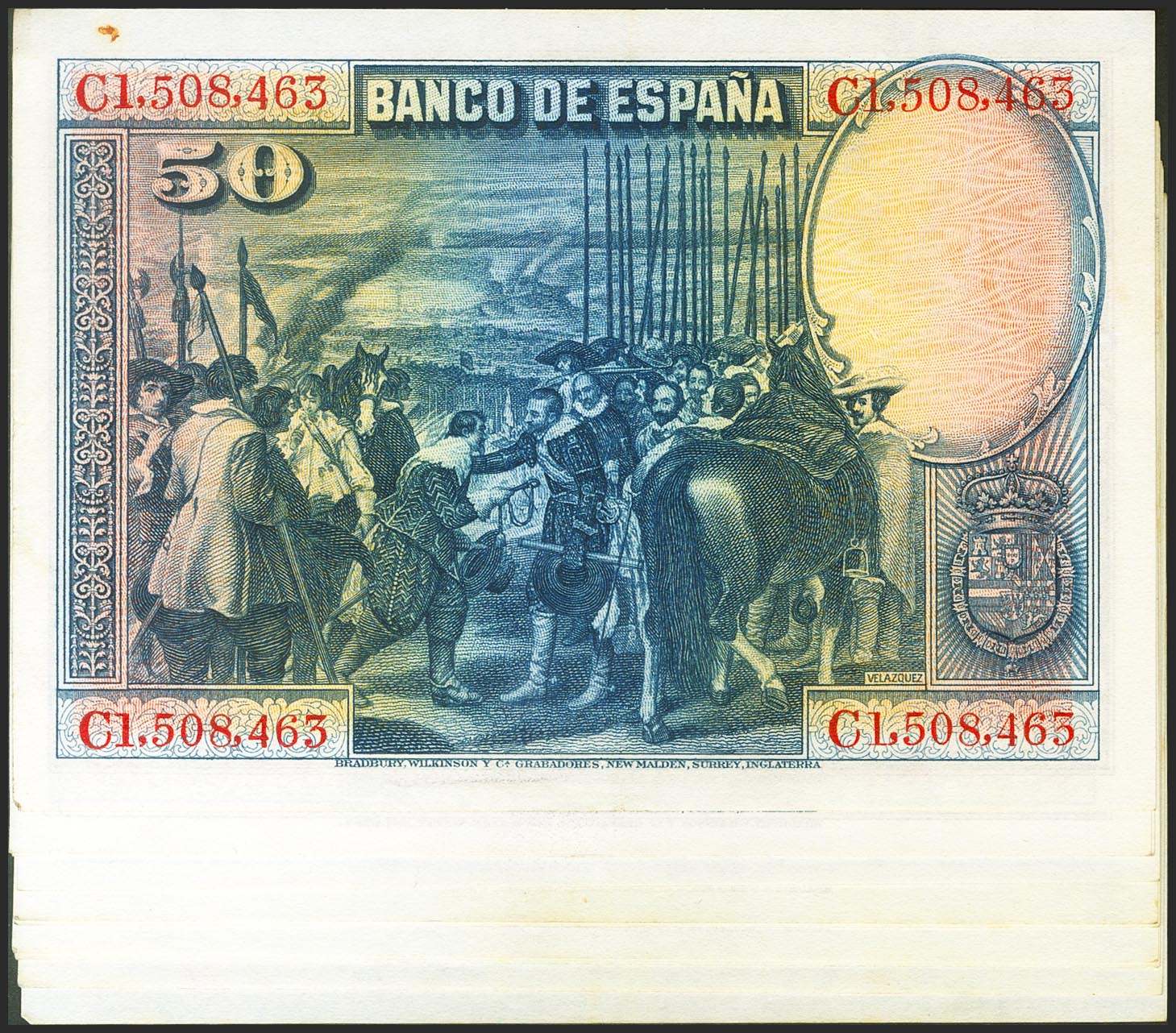 Conjunto de 10 billetes mayoritariamente correlativos y en diferentes tramos de 50 Pesetas emitidos el 15 de Agosto de 1928 y con la serie C (Edifil 2021: 354), conservando la mayor parte del apresto original. EBC+.