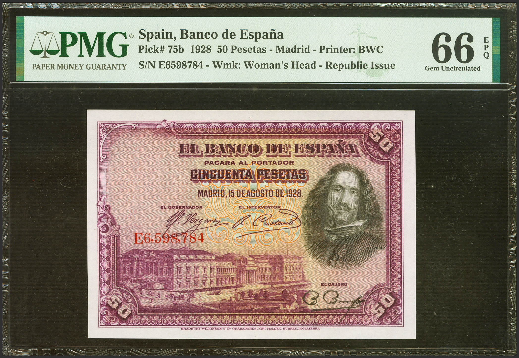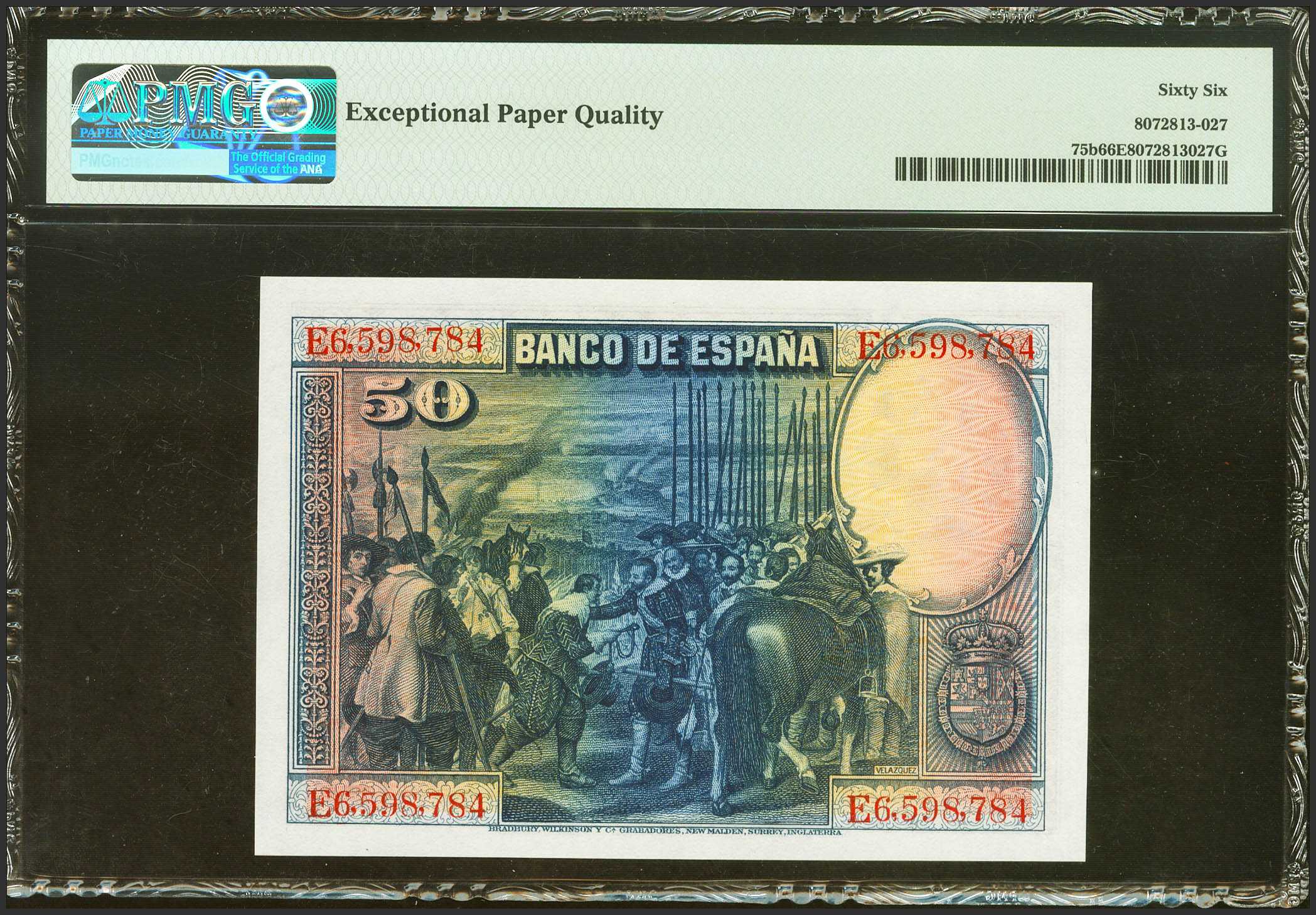50 Pesetas. 15 de Agosto de 1928. Serie E, última serie emitida. (Edifil 2021: 354, Pick: 75b). Apresto original. SC. Encapsulado PMG66EPQ.