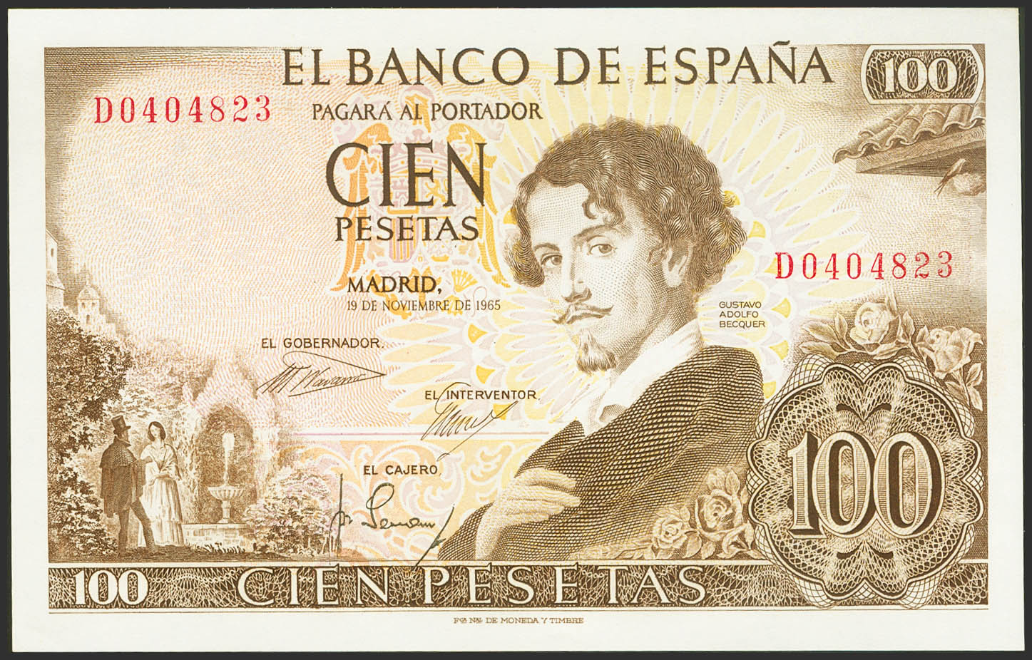 100 Pesetas. 19 de Noviembre de 1965. Serie D. (Edifil 2023: 470a). Apresto original. SC.