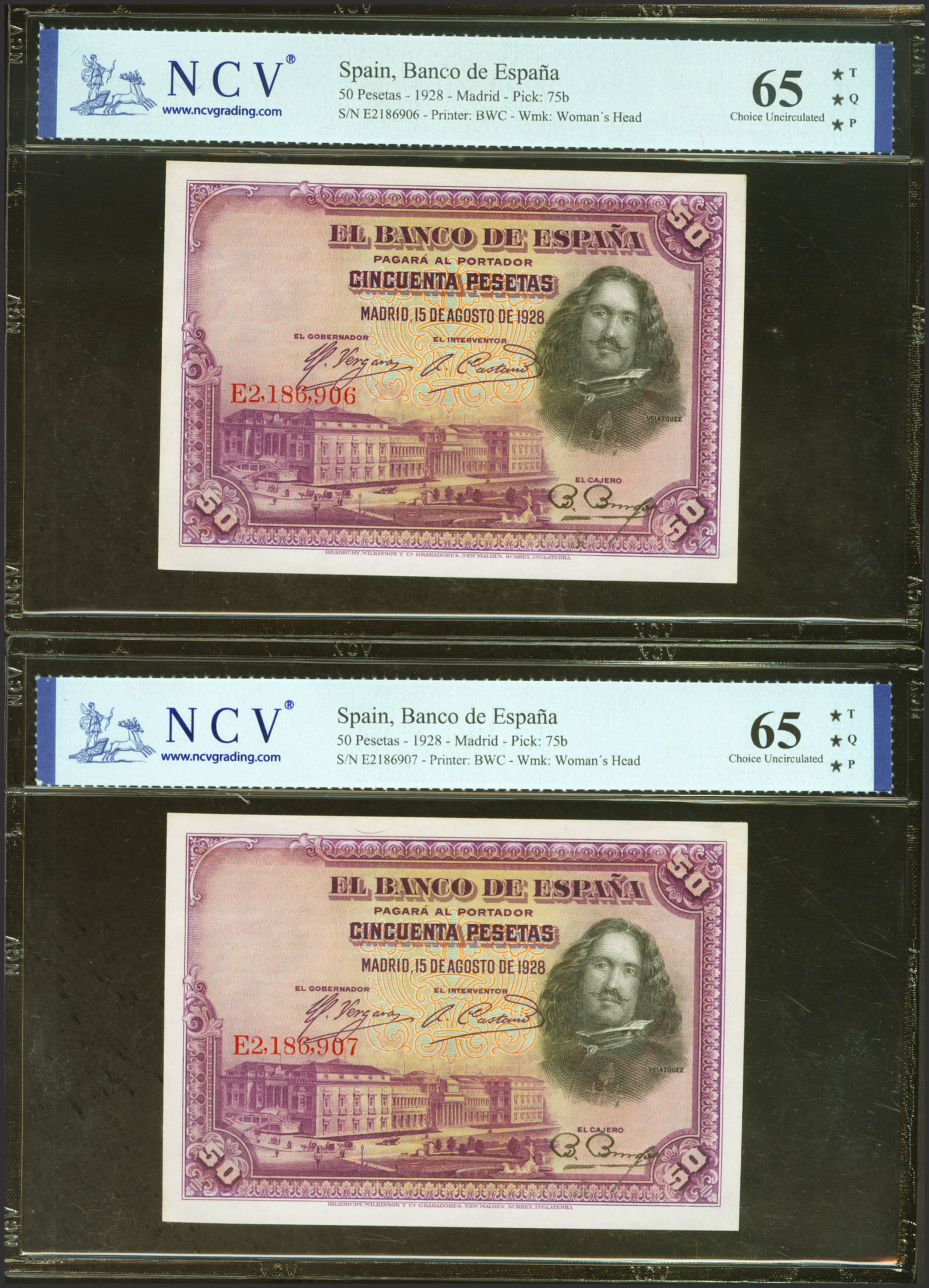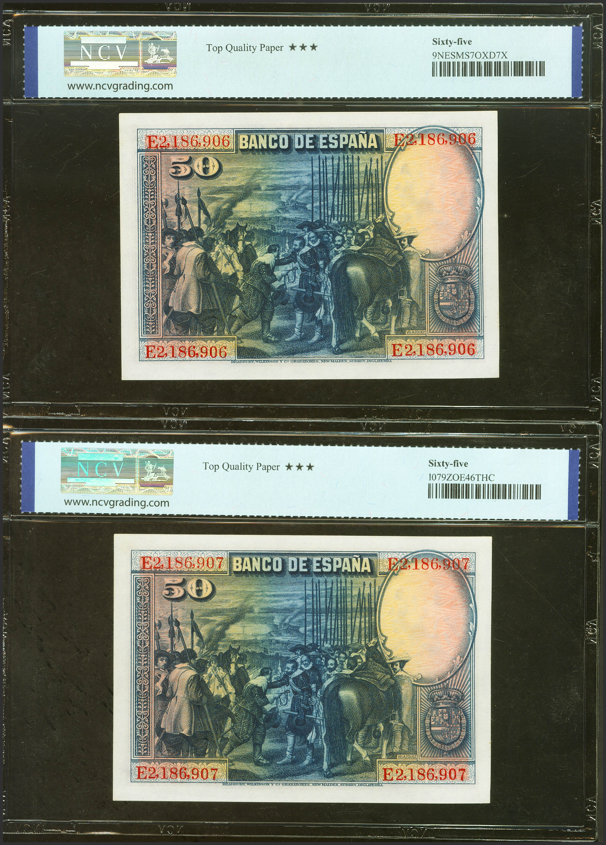 50 Pesetas. 15 de Agosto de 1928. Pareja correlativa. Serie E. (Edifil 2021: 354, Pick: 75b). Apresto original. SC. Encapsulados NCV65TQP, ambos.