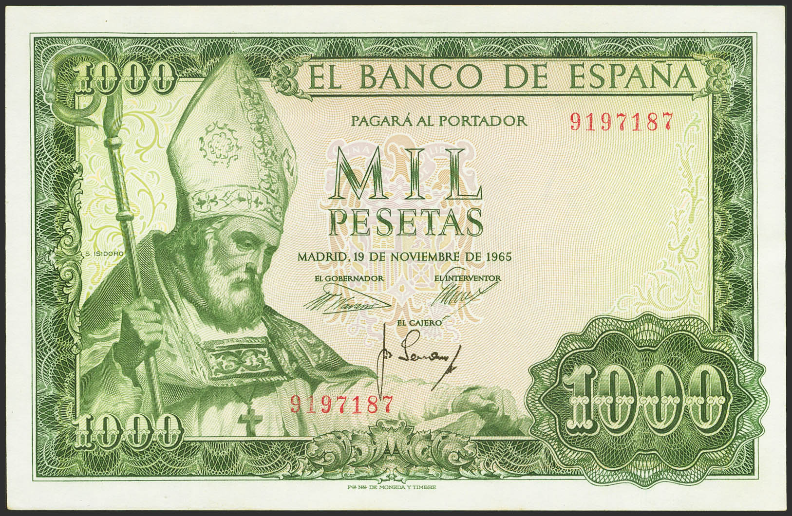 1000 Pesetas. 19 de Noviembre de 1965. Sin serie. (Edifil 2021: 471). Conserva gran parte del apresto original. EBC++.