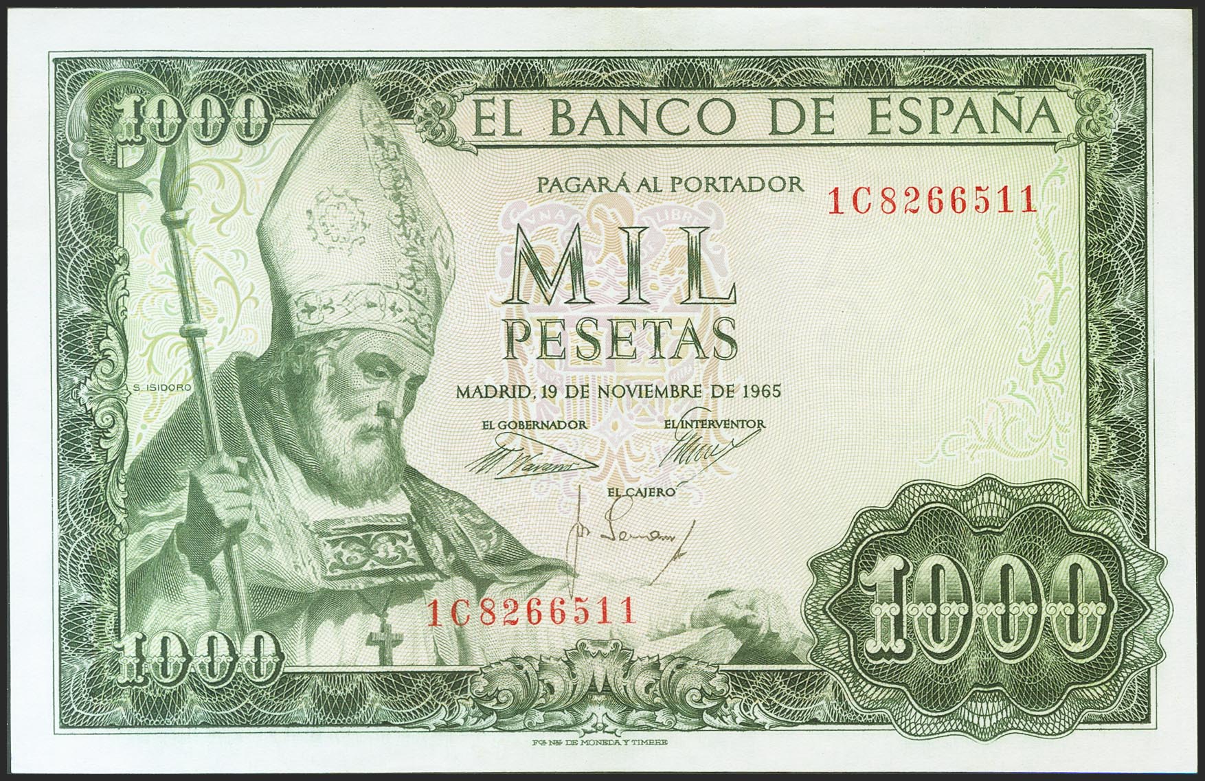 1000 Pesetas. 19 de Noviembre de 1965. Serie 1C. (Edifil 2021: 471b). Conserva gran parte de su apresto original. SC-.