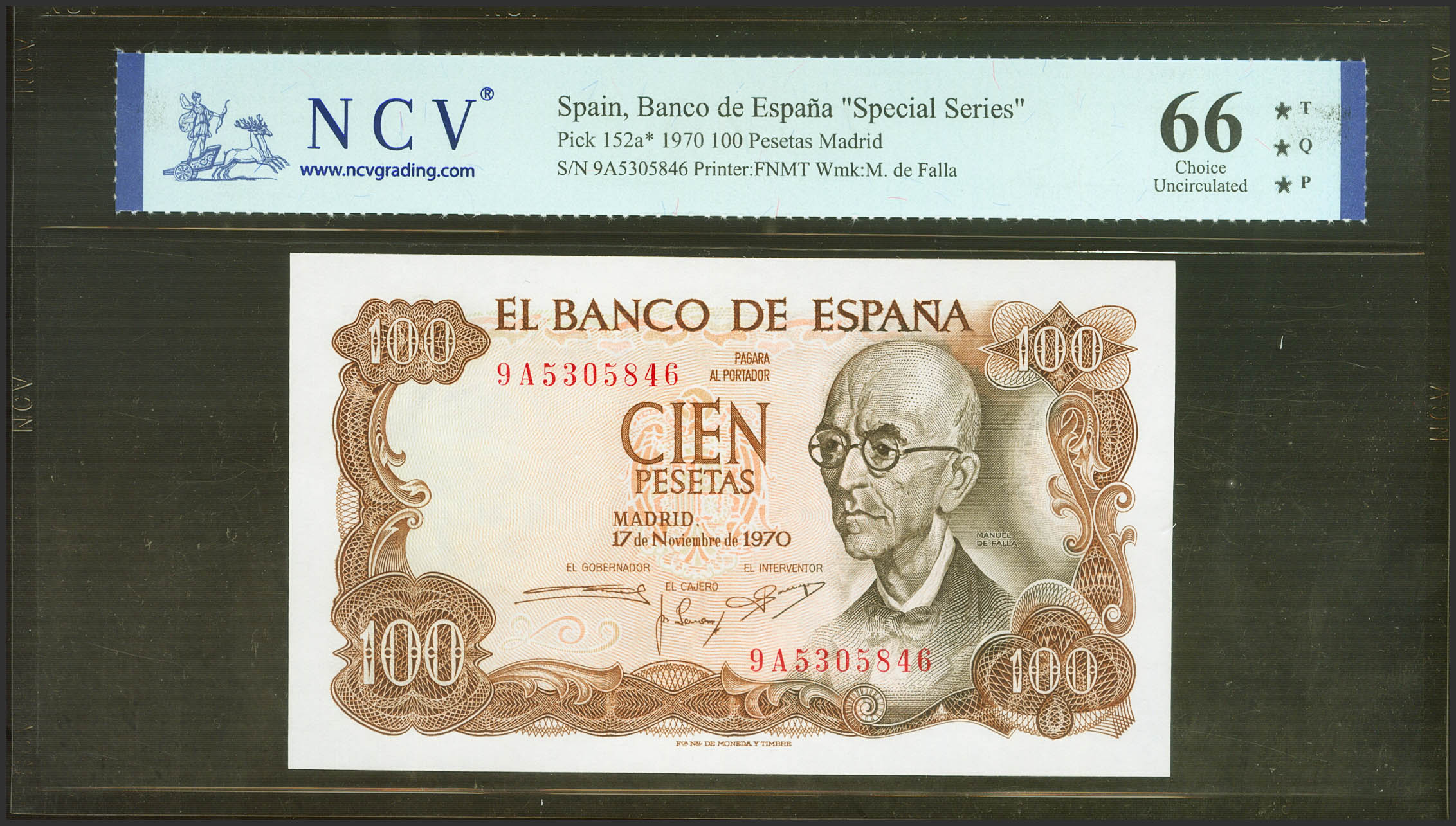 100 Pesetas. 17 de Noviembre de 1970. Serie especial 9A. (Edifil 2021: 472d, Pick: 152a*). Apresto original. SC. Encapsulado NCV66TQP.