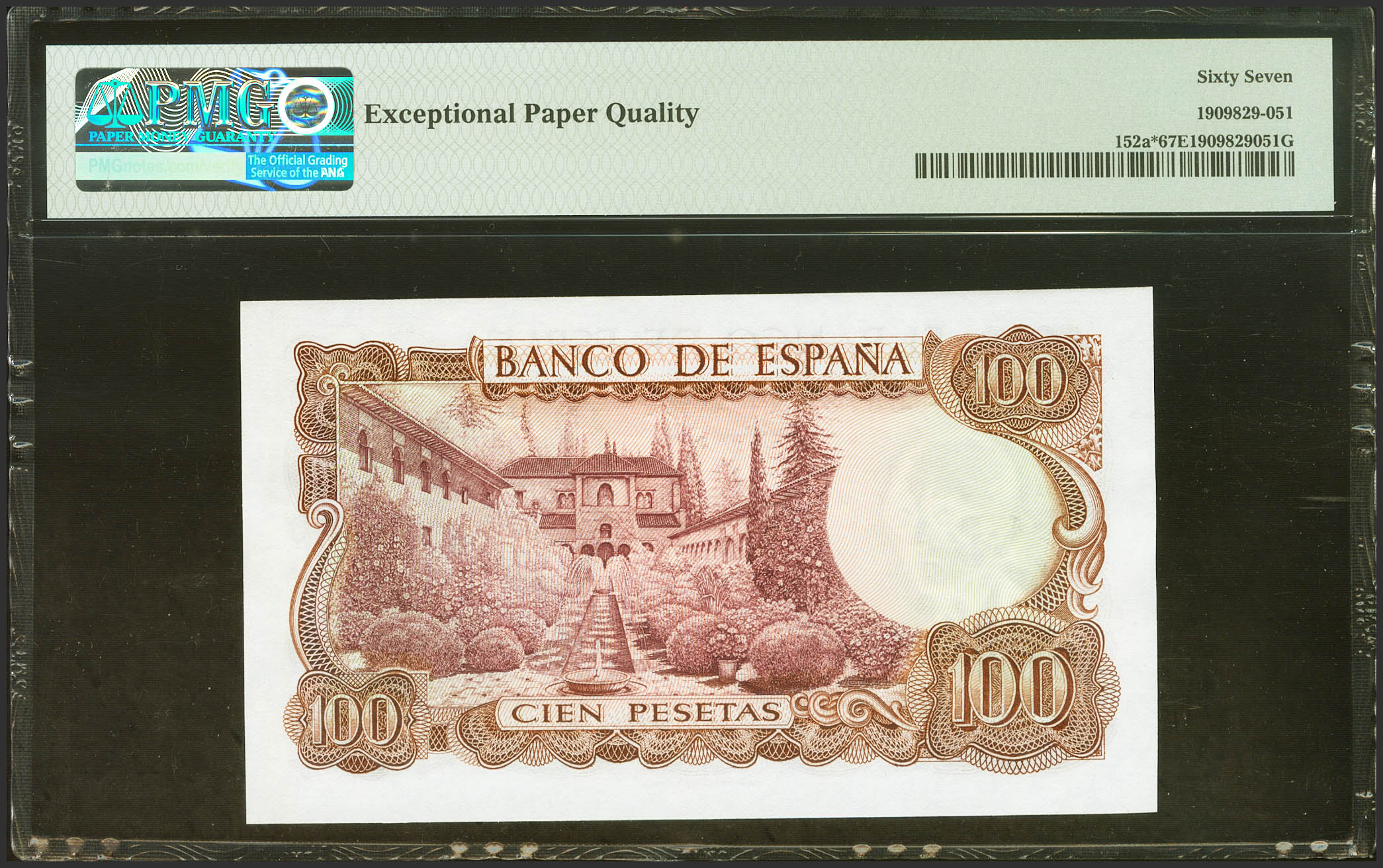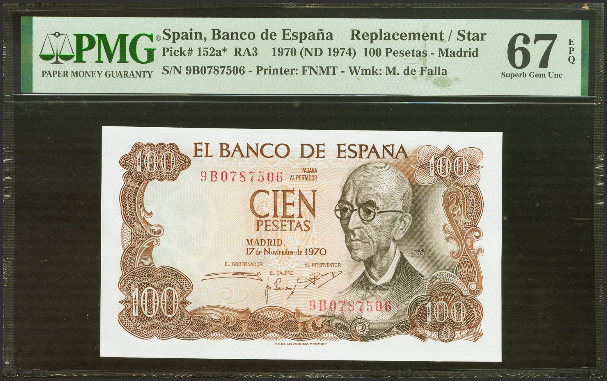 100 Pesetas. 17 de Noviembre de 1970. Serie especial 9B. (Edifil 2023: 472d, Pick: 152a*). Inusual en esta calidad, apresto original. SC. Encapsulado PMG67EPQ.