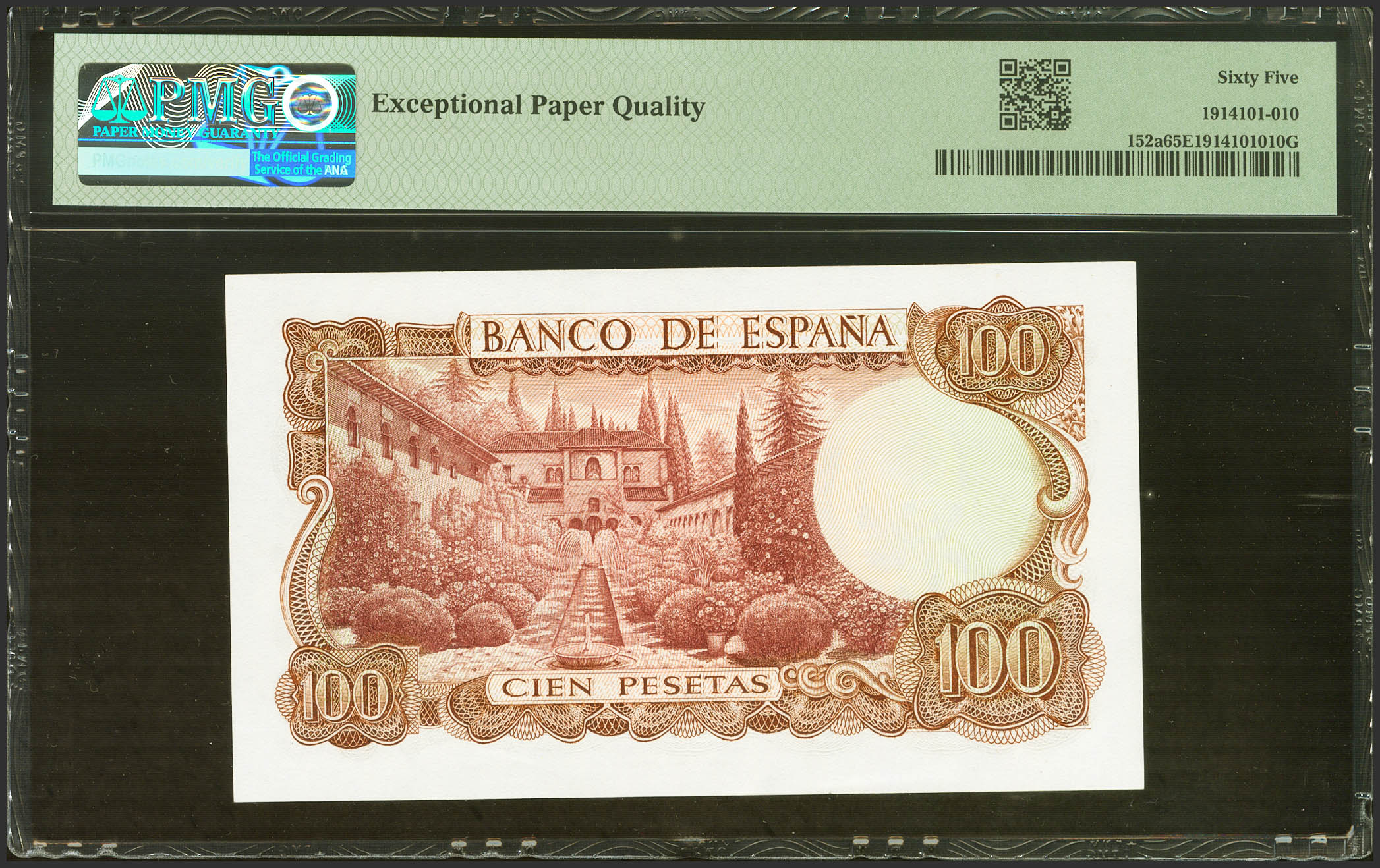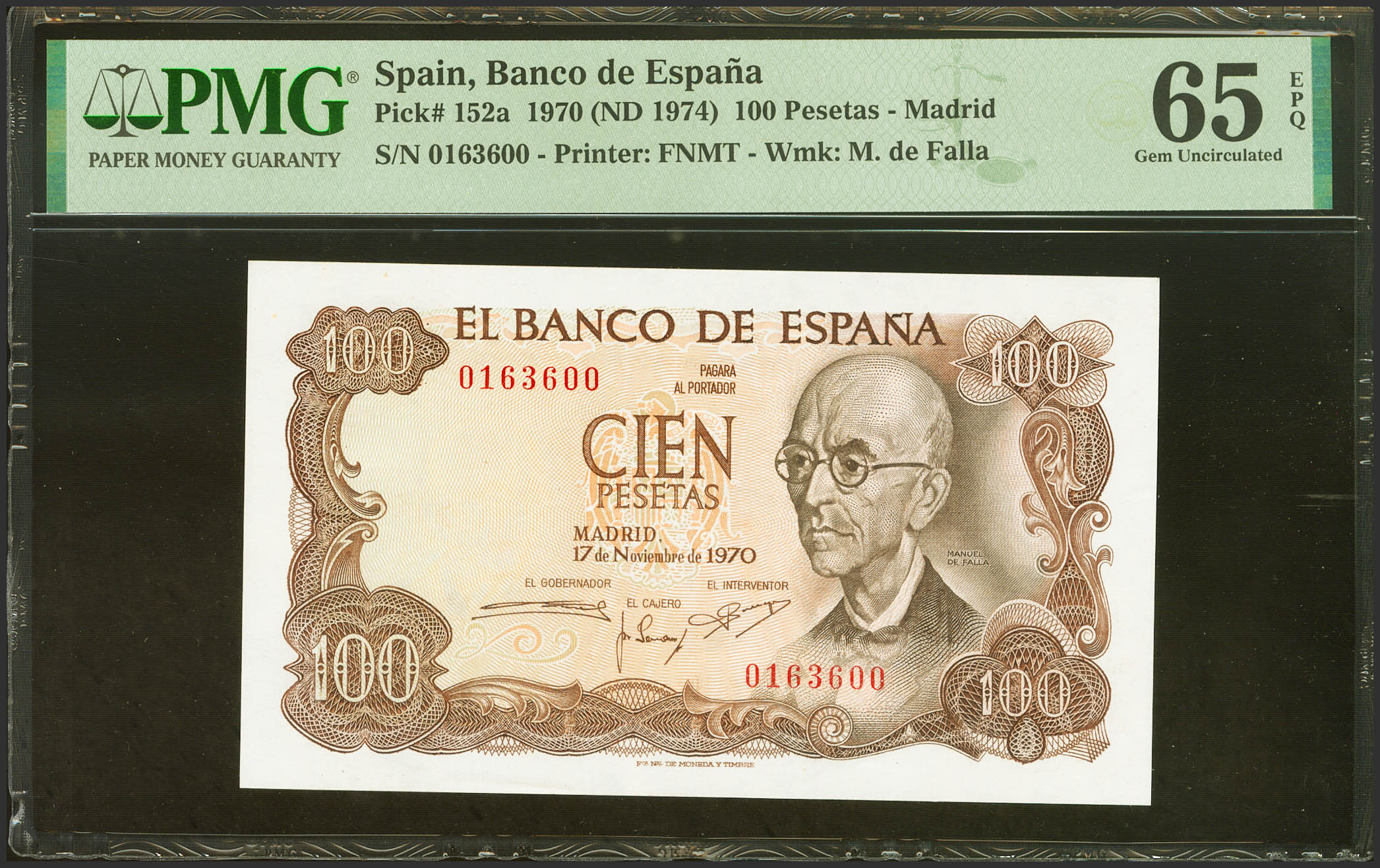 100 Pesetas. 17 de Noviembre de 1970. Sin serie. (Edifil 2023: 472, Pick: 152a). Apresto original. SC. Encapsulado PMG65EPQ.