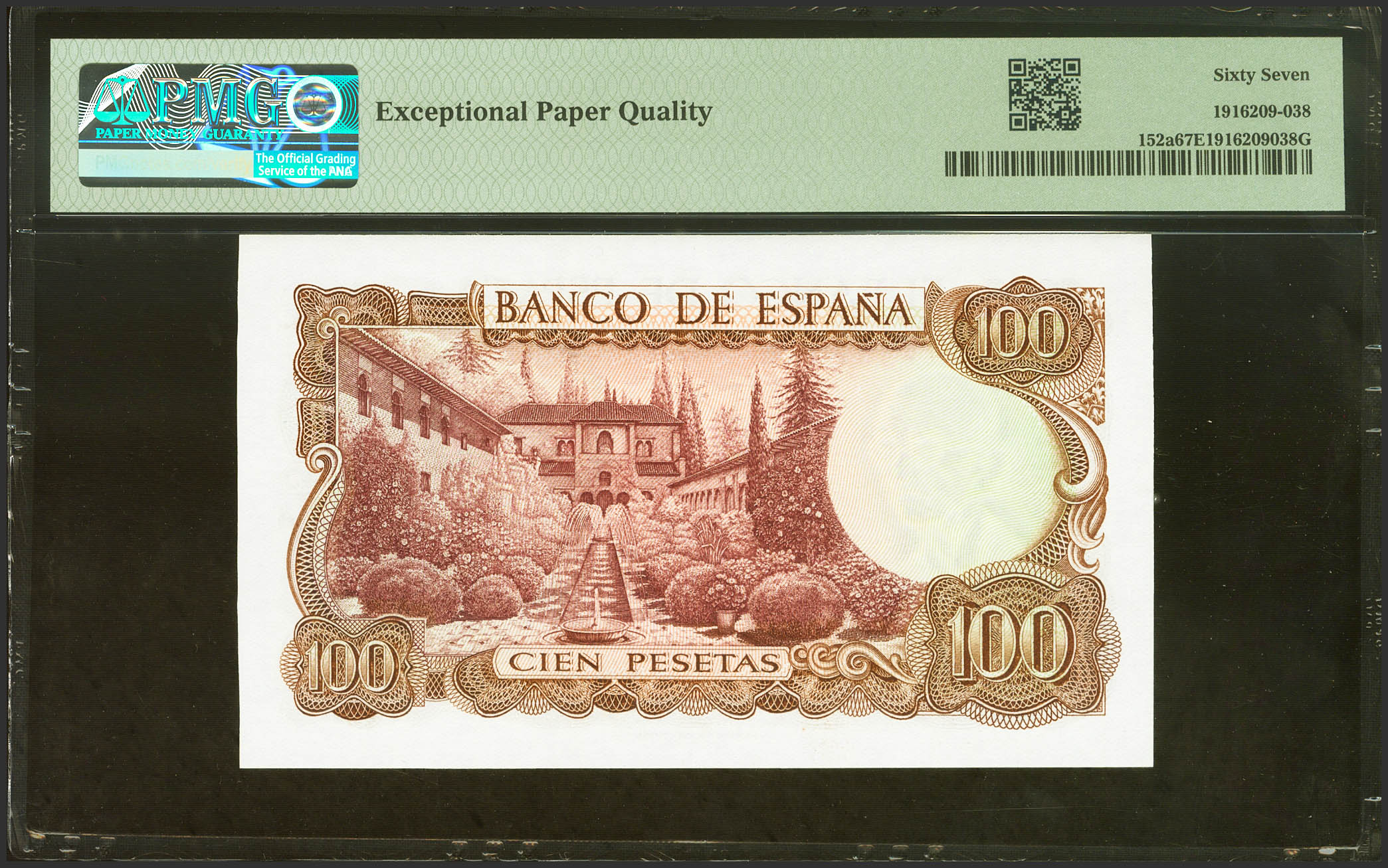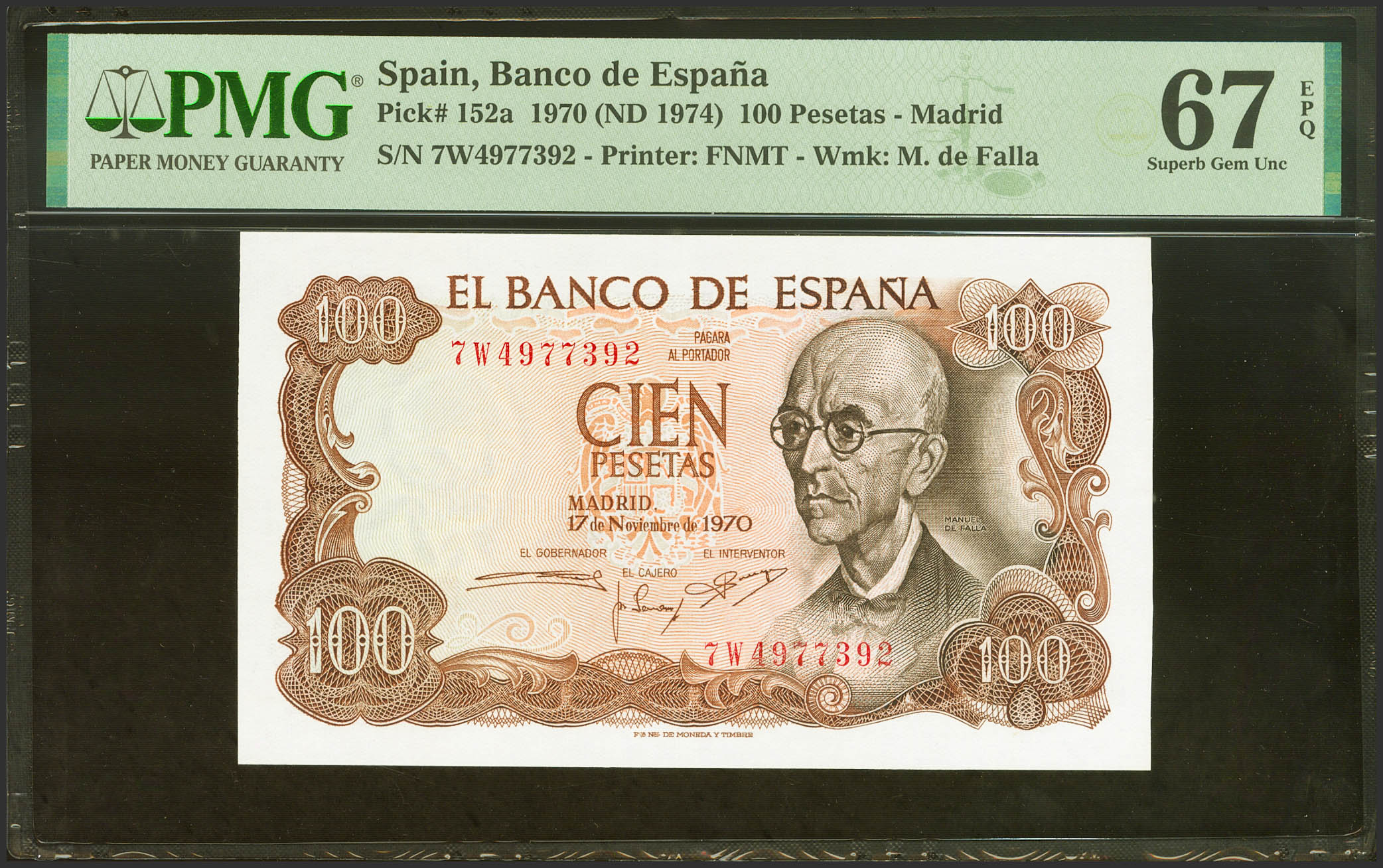 100 Pesetas. 17 de Noviembre de 1970. Serie 7W, última serie emitida. (Edifil 2023: 472c, Pick: 152a). Apresto original. SC. Encapsulado PMG67EPQ.