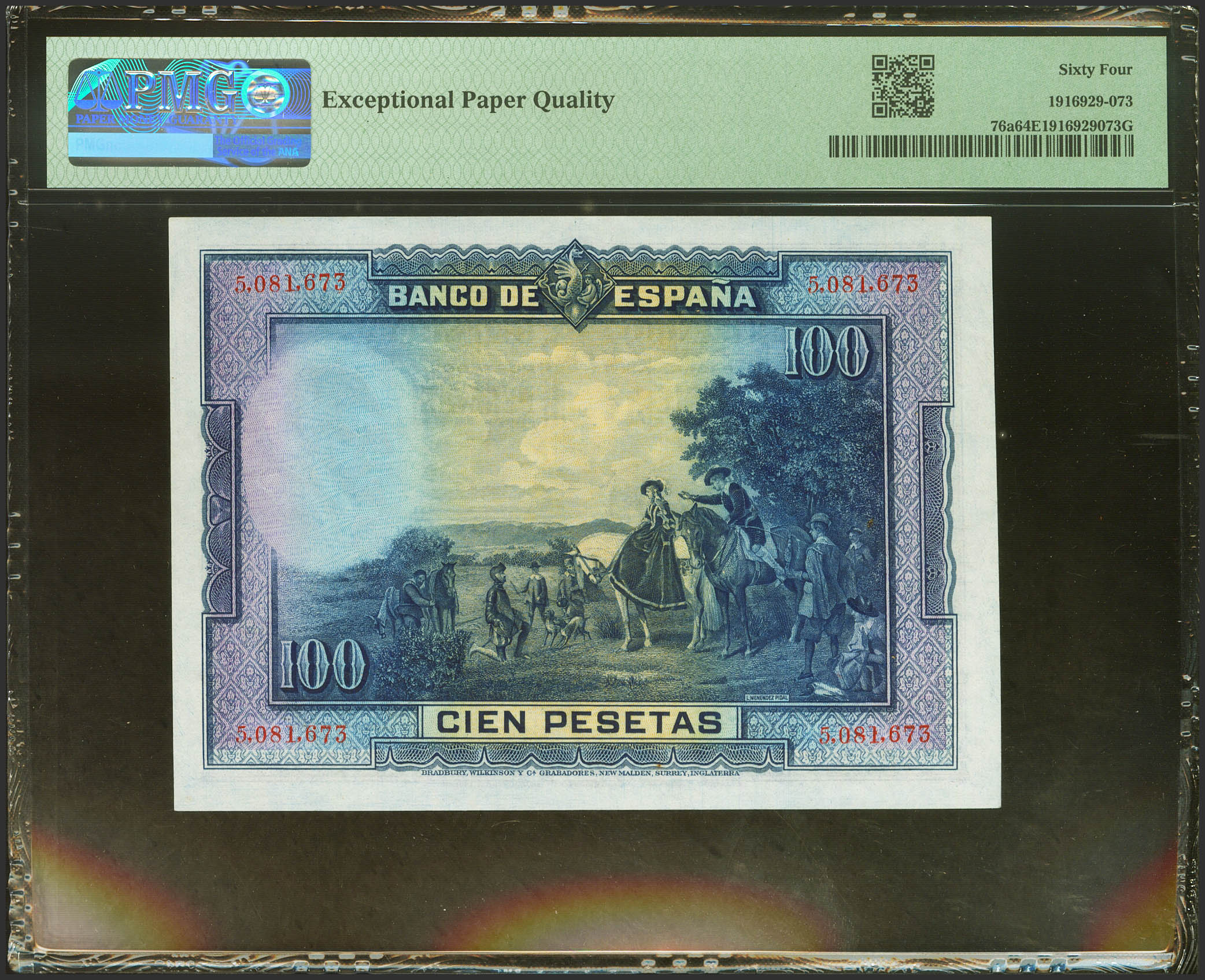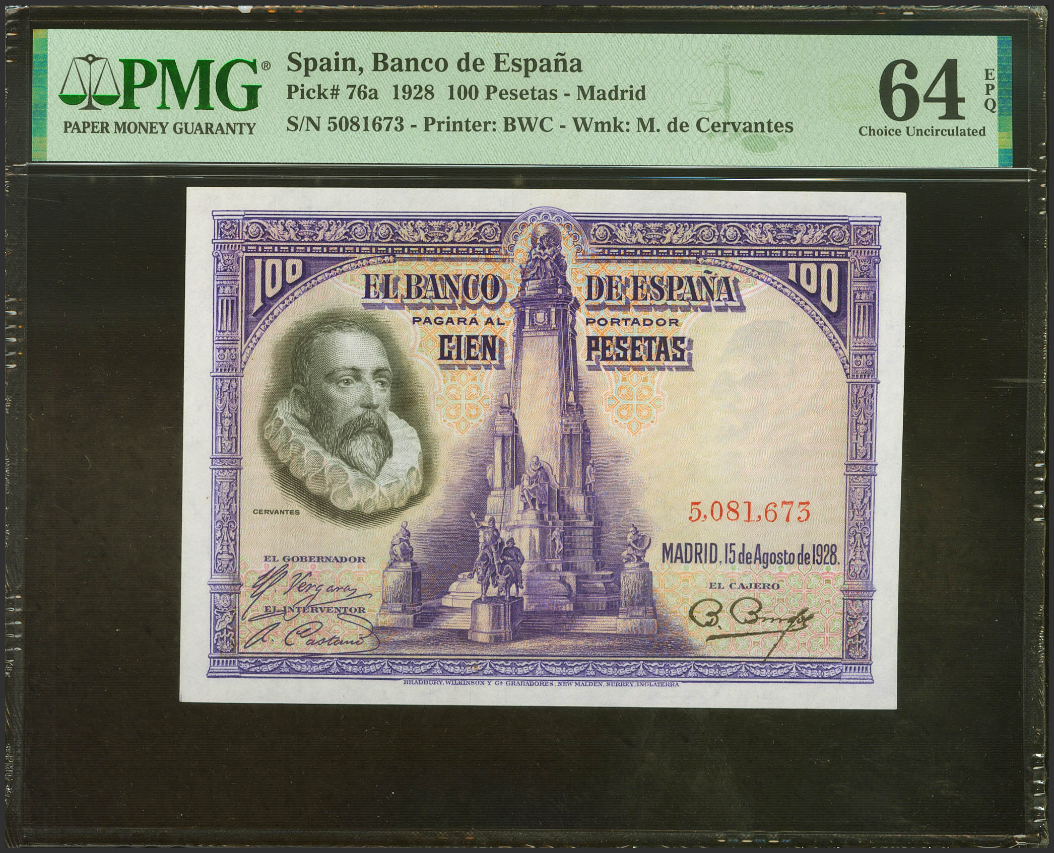 100 Pesetas. 15 de Agosto de 1928. Sin serie. (Edifil 2023: 355, Pick: 76a). Inusual en esta calidad, apresto original. SC. Encapsulado PMG64EPQ.