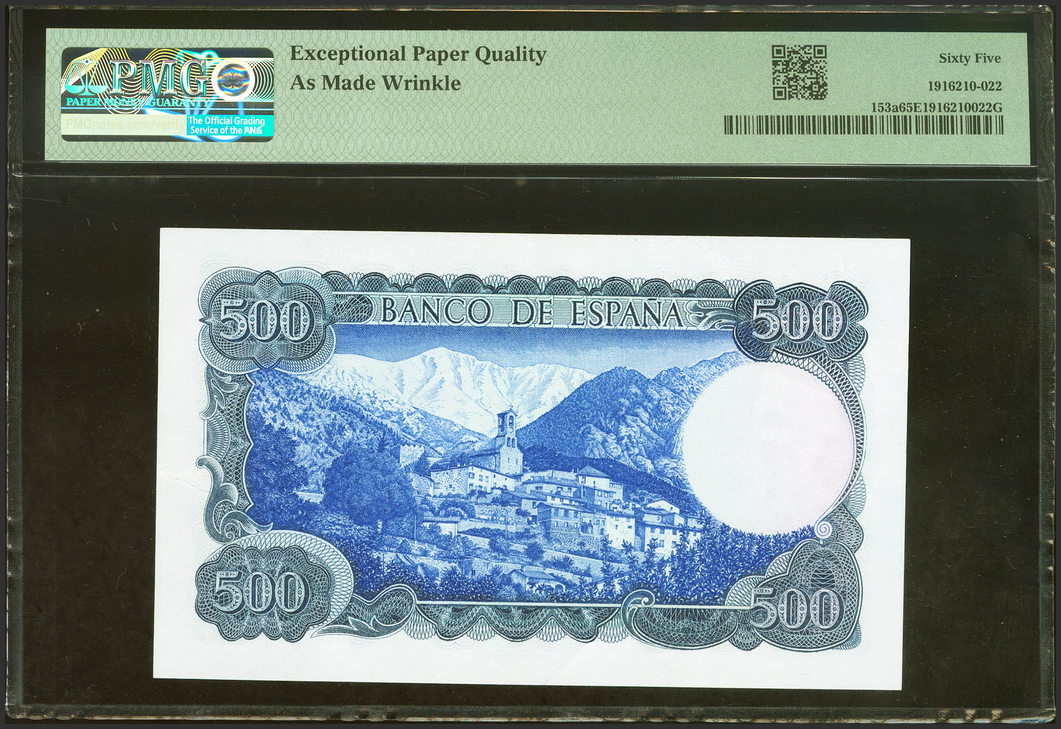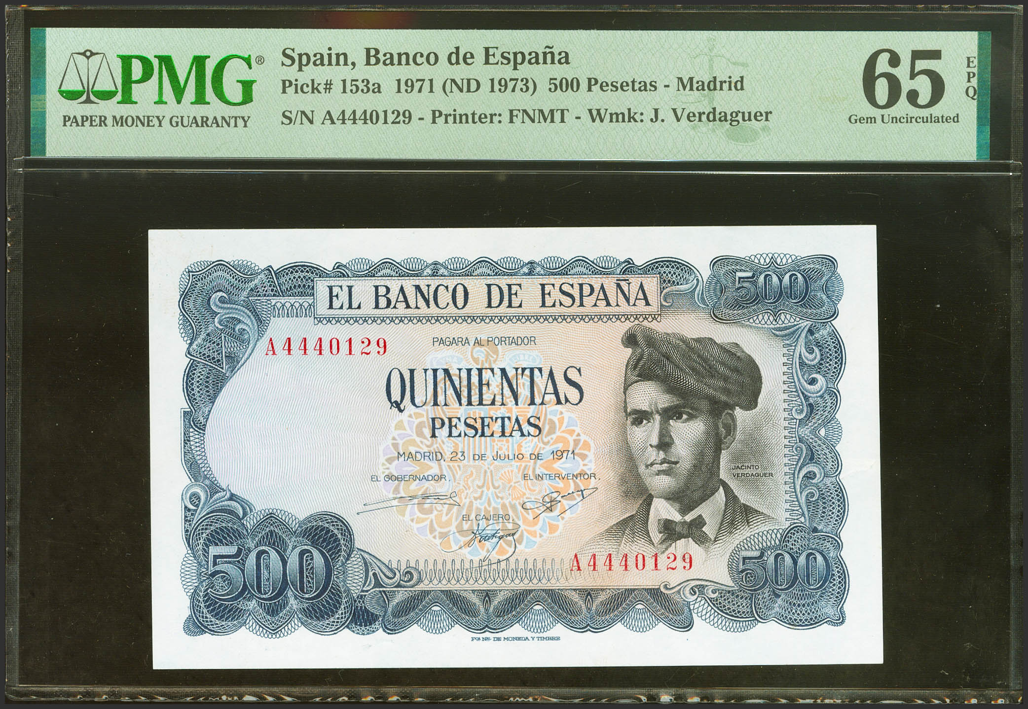 500 Pesetas. 23 de Julio de 1971. Serie A. (Edifil 2023: 473a, Pick: 153a). Inusual en esta excepcional calidad. SC. Encapsulado PMG65EPQ.