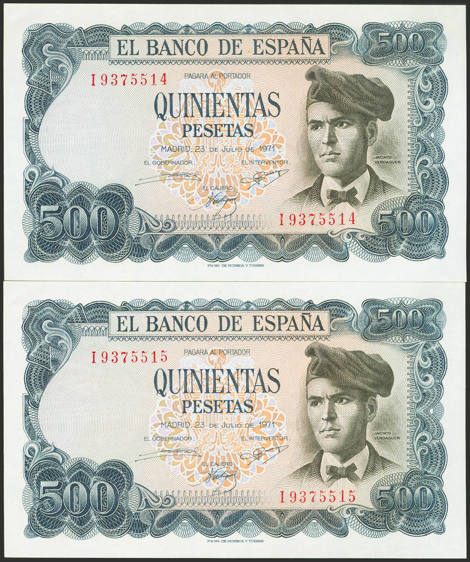 500 Pesetas. 23 de Julio de 1971. Pareja correlativa. Serie I. (Edifil 2023: 473a). Conserva todo su apresto original. SC.