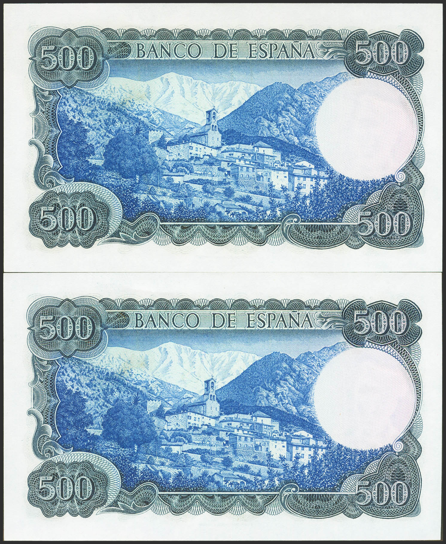 500 Pesetas. 23 de Julio de 1971. Pareja correlativa. Serie K. (Edifil 2023: 473a). Conserva todo su apresto original. SC.