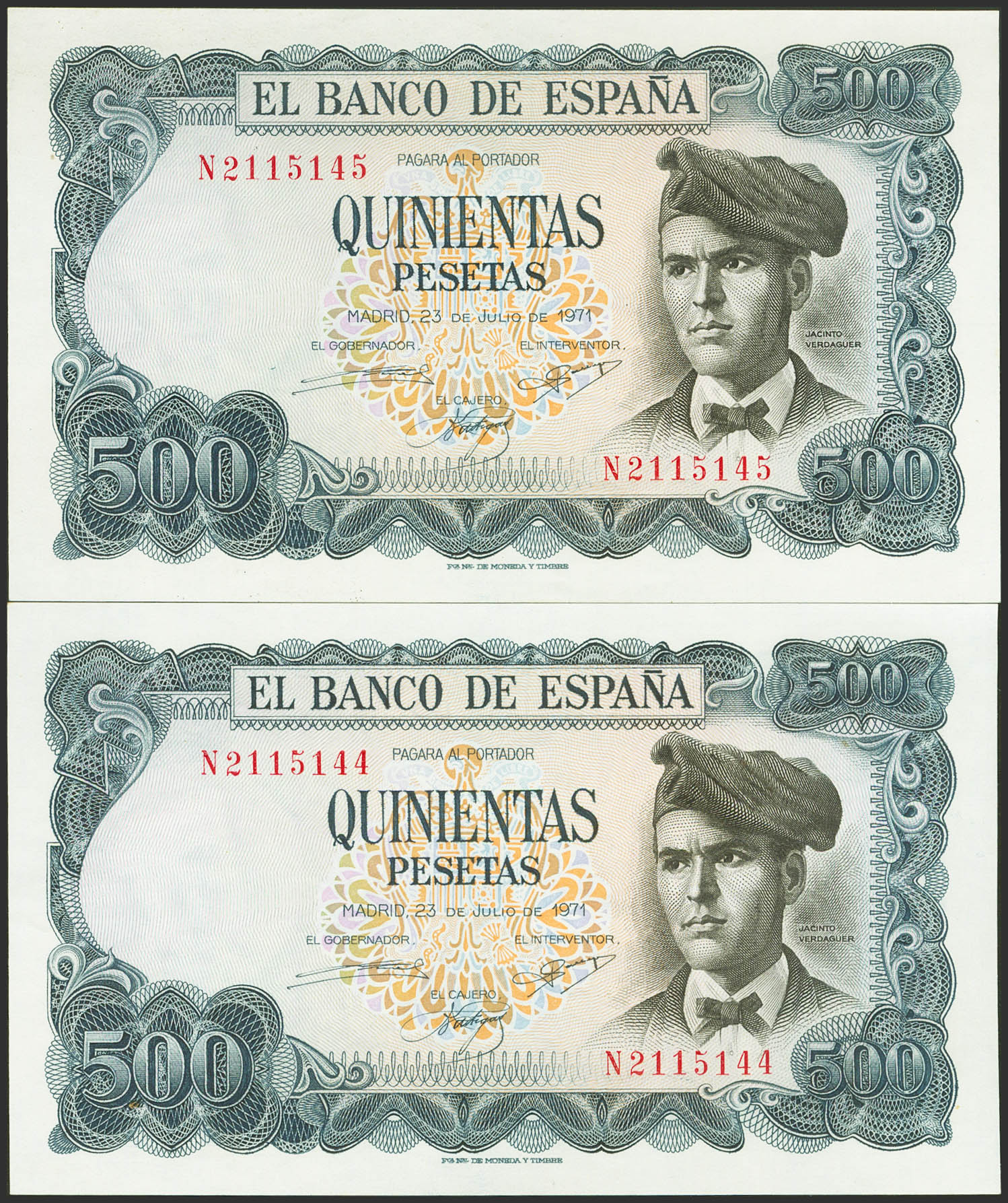 500 Pesetas. 23 de Julio de 1971. Pareja correlativa. Serie N. (Edifil 2023: 473a). Conserva todo su apresto original. SC-.