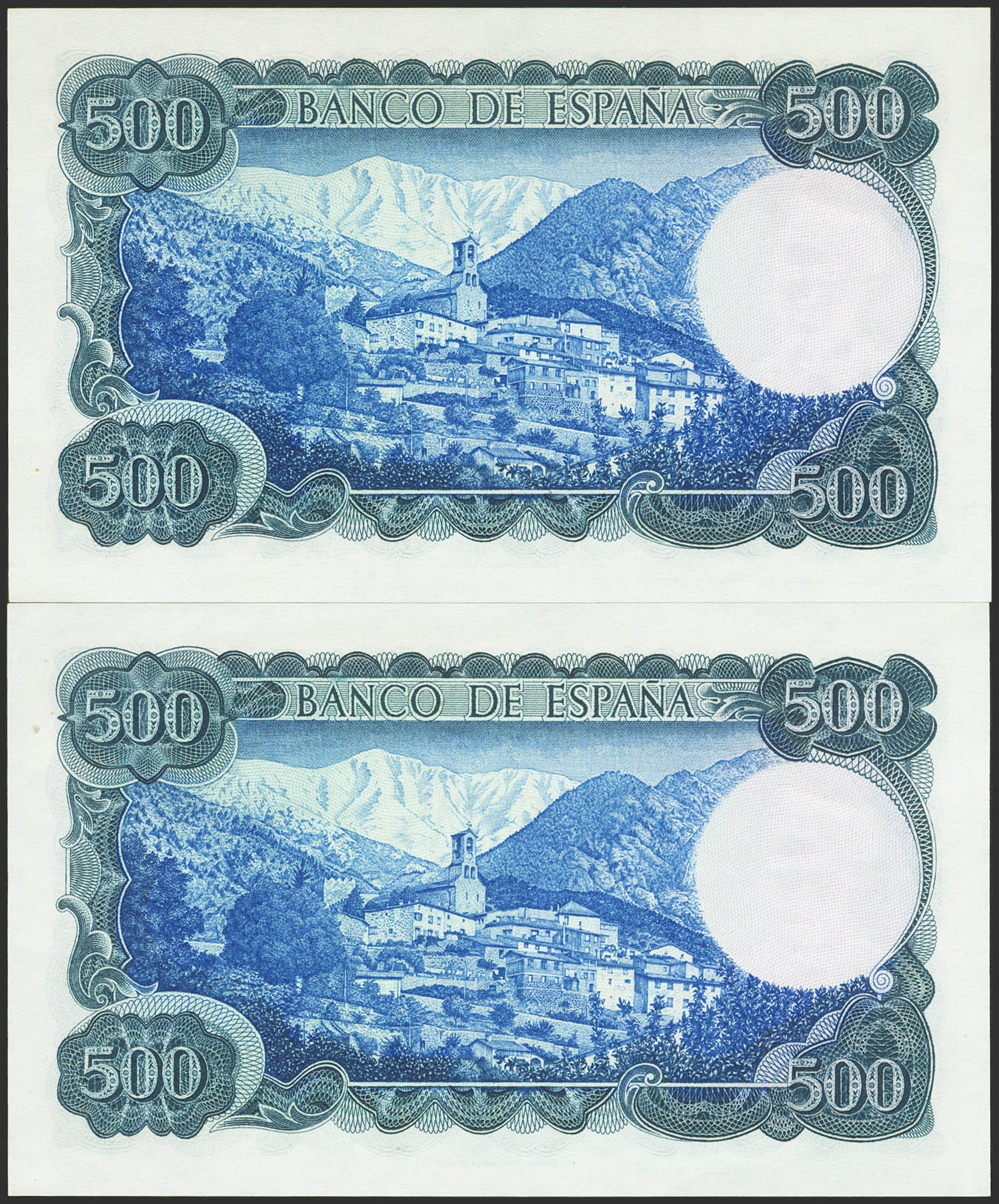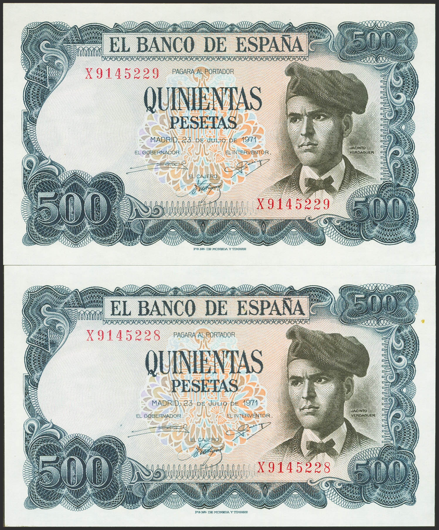 500 Pesetas. 23 de Julio de 1971. Pareja correlativa. Serie X. (Edifil 2023: 473a). Conserva todo su apresto original, uno de los billetes puntito natural del papel. SC-.