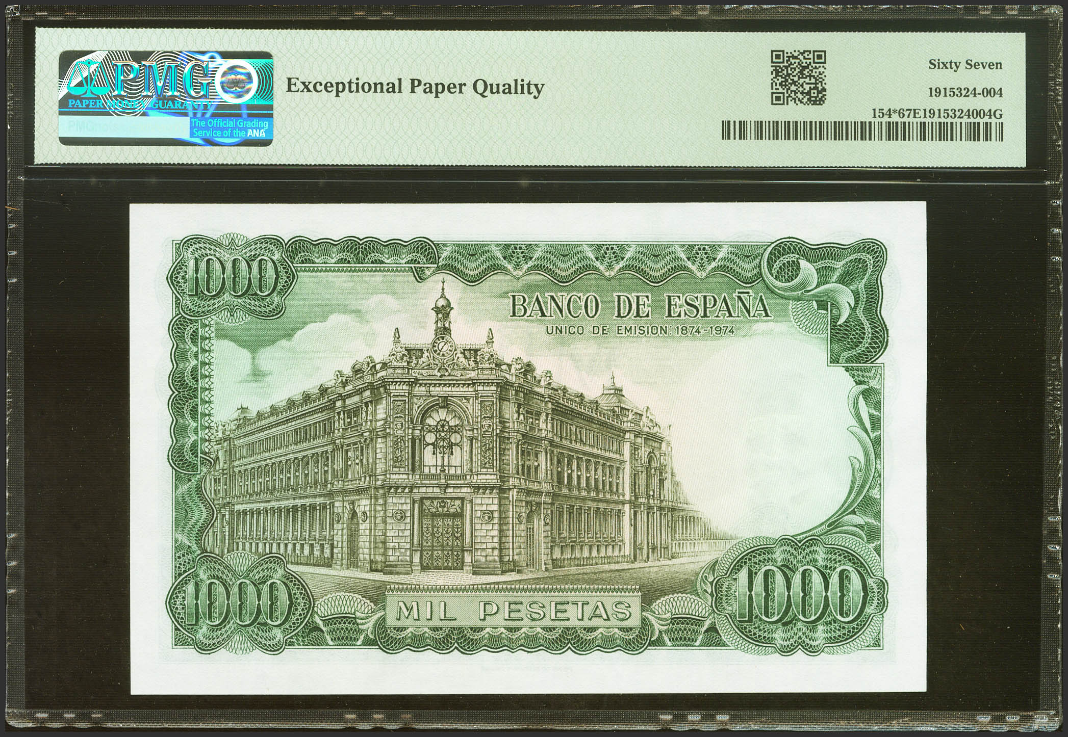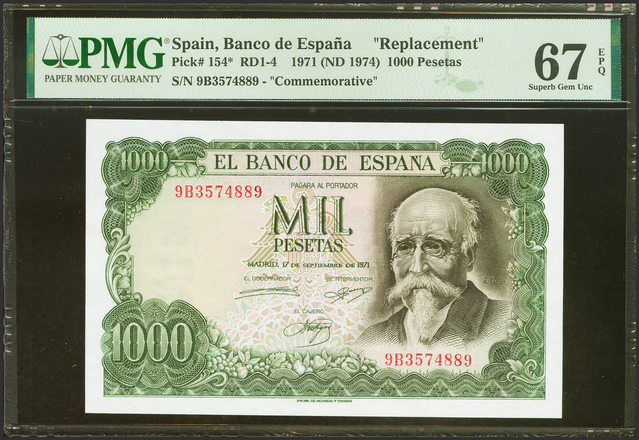 1000 Pesetas. 17 de Septiembre de 1971. Serie especial 9B. (Edifil 2023: 474d, Pick: 154*). Muy raro en esta excepcional calidad, apresto original. SC. Encapsulado PMG67EPQ.