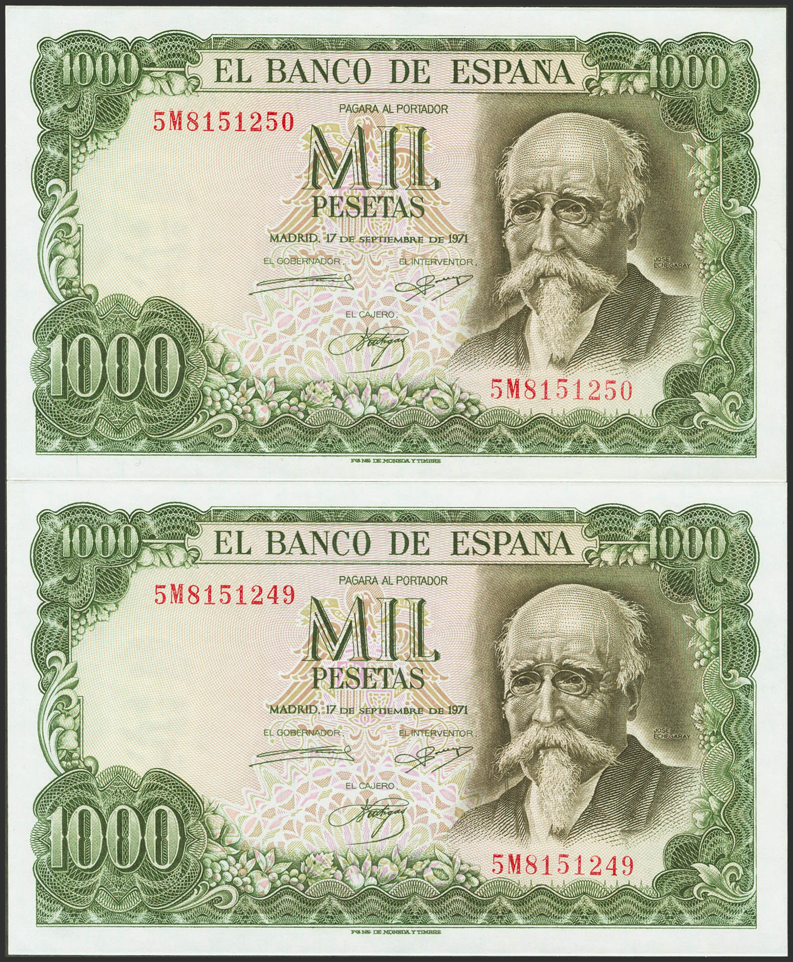 1000 Pesetas. 17 de Septiembre de 1971. Pareja correlativa. Serie 5M. (Edifil 2021: 474c). Apresto original. SC.