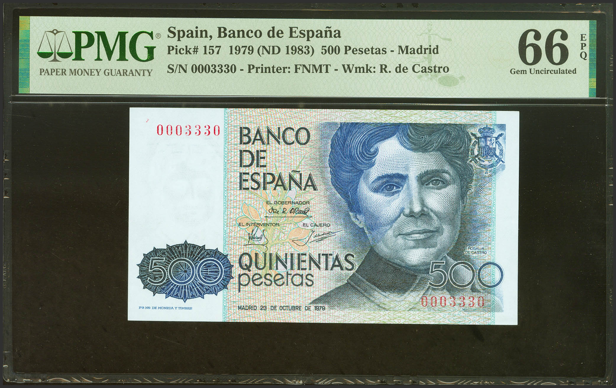 500 Pesetas. 23 de Octubre de 1979. Sin serie y numeración bajísima. (Edifil 2021: 476, Pick: 157). Inusual en esta calidad. SC. Encapsulado PMG66EPQ.