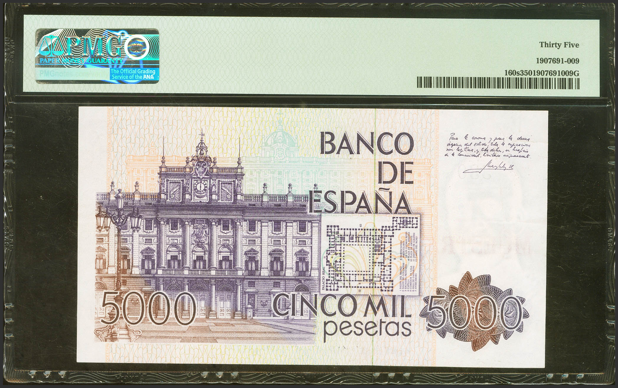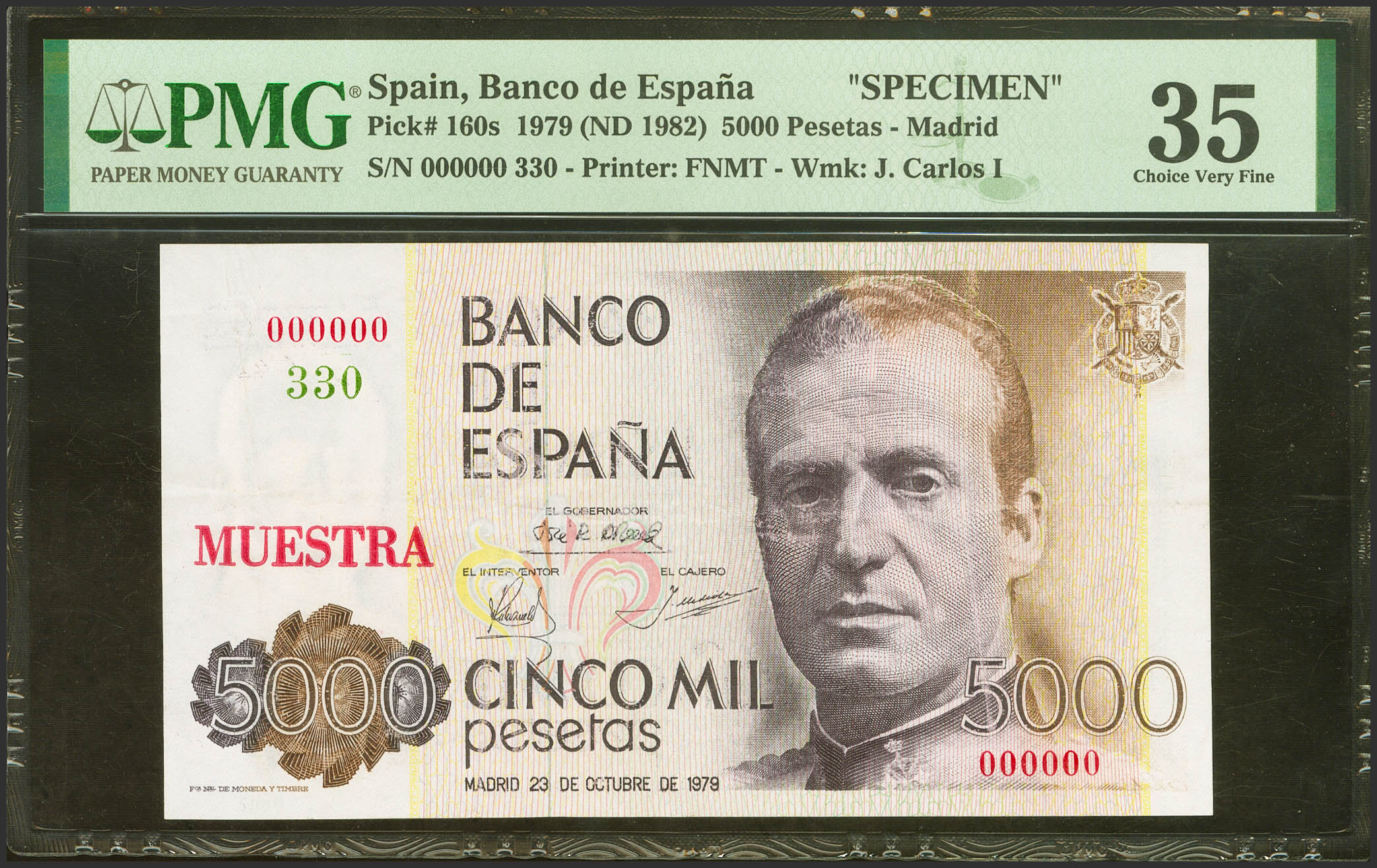 5000 Pesetas. 23 de Octubre de 1979. Sin serie. MUESTRA y numeración 330, en verde. (Edifil 2023: 478M). MBC+. Encapsulado PMG35.