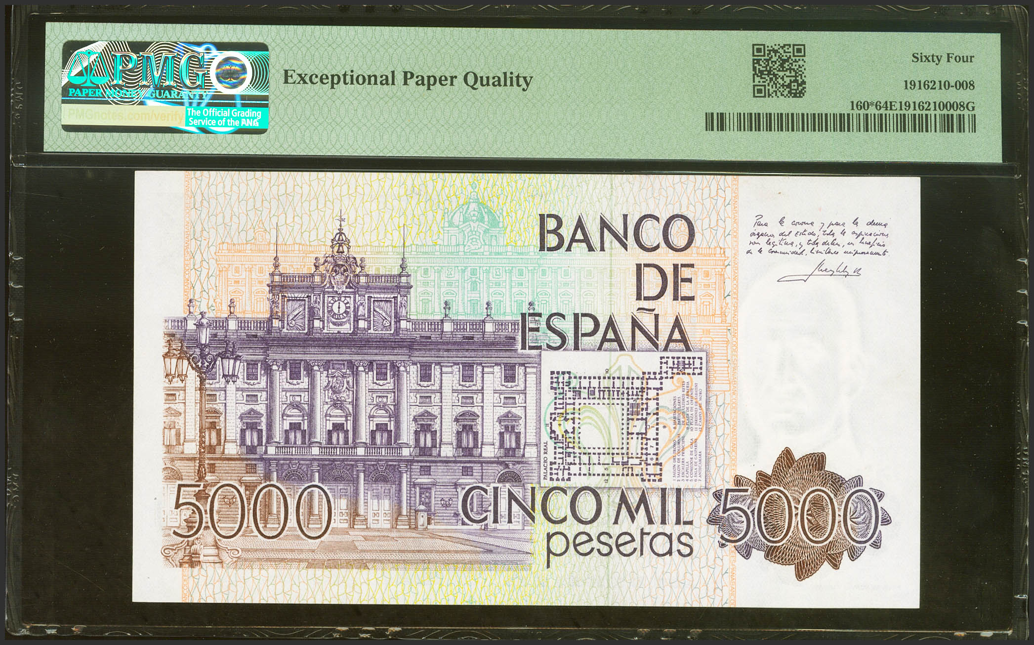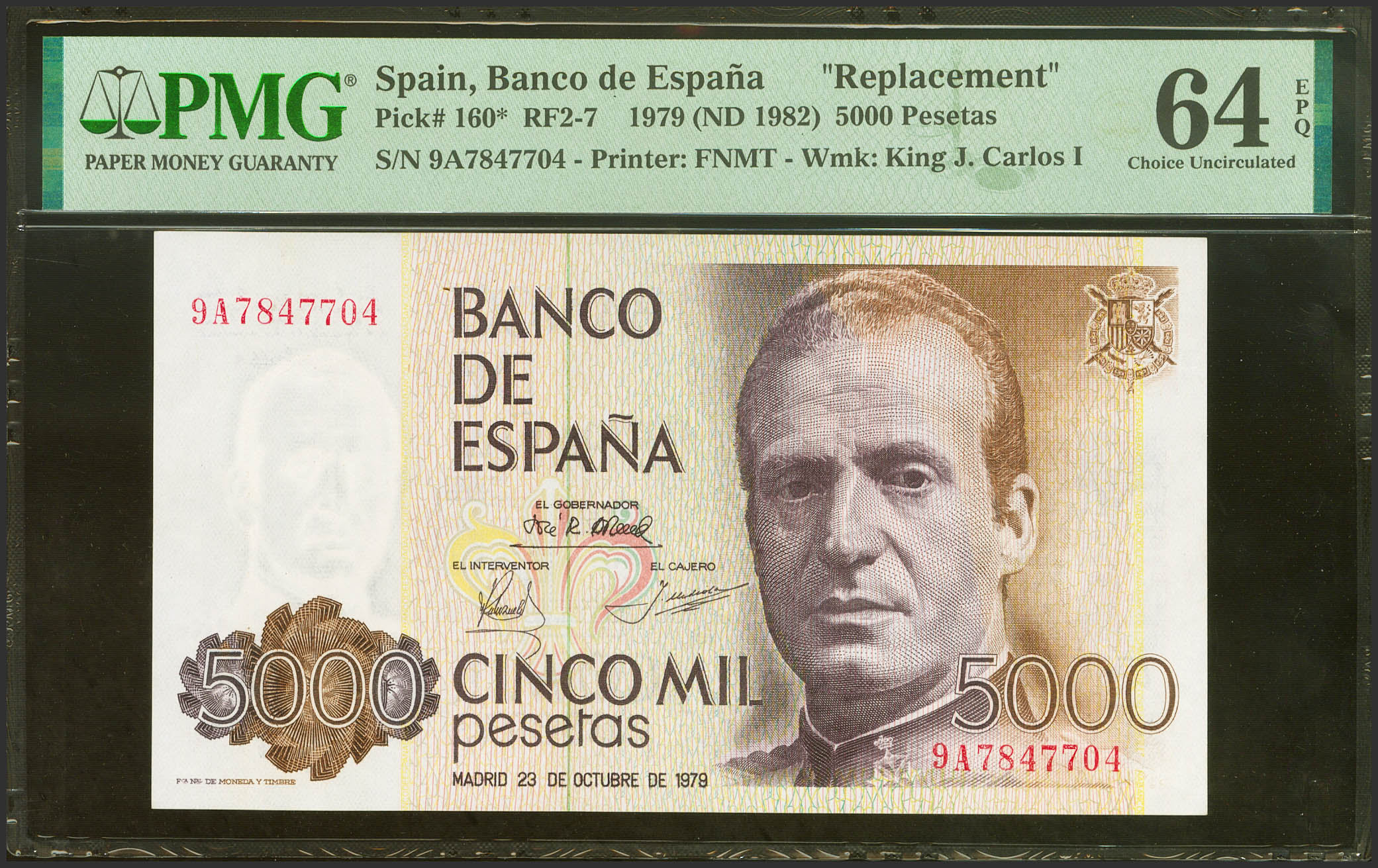 5000 Pesetas. 23 de Octubre de 1979. Serie especial 9A. (Edifil 2023: 478b, Pick: 160*). SC. Encapsulado PMG64EPQ.