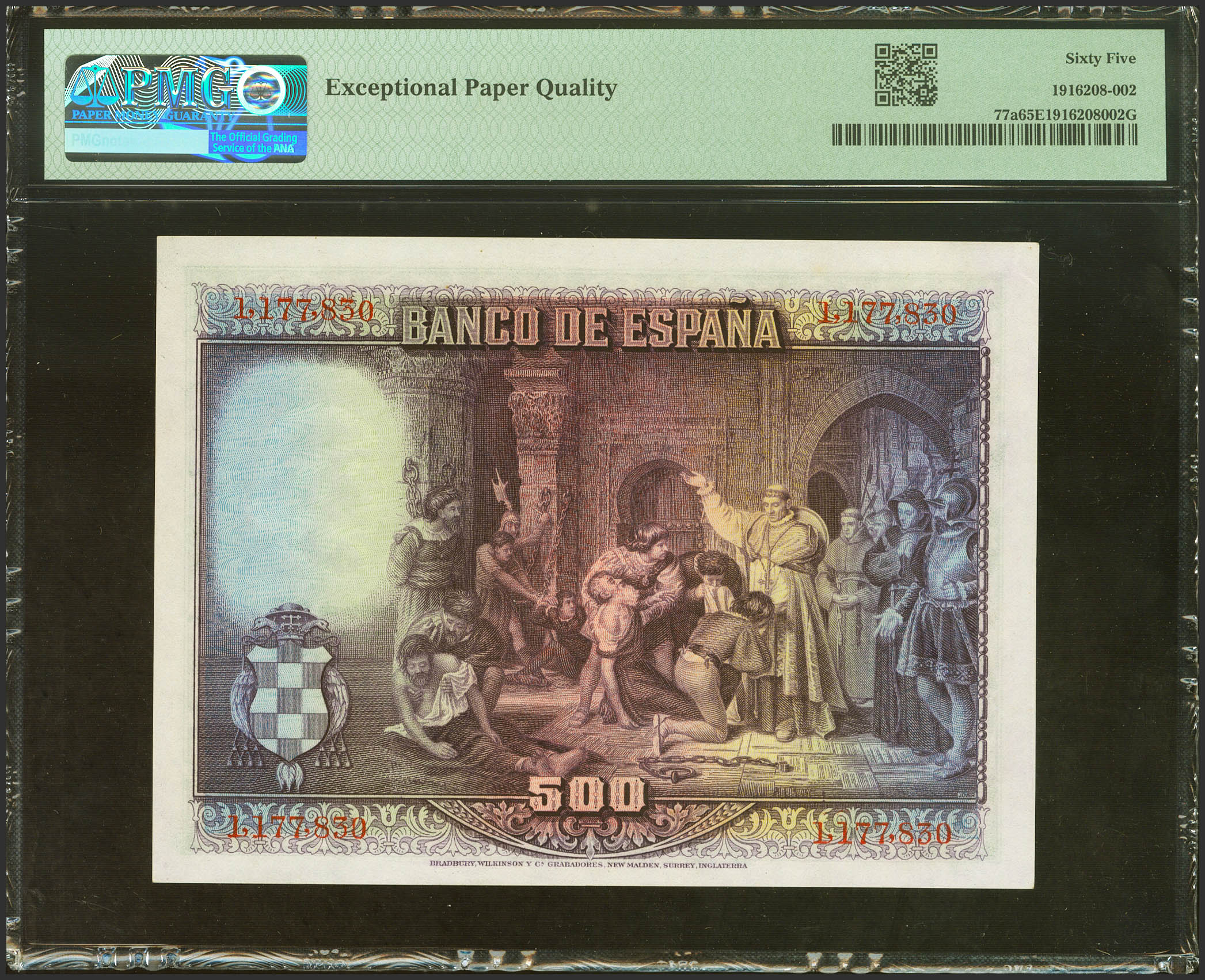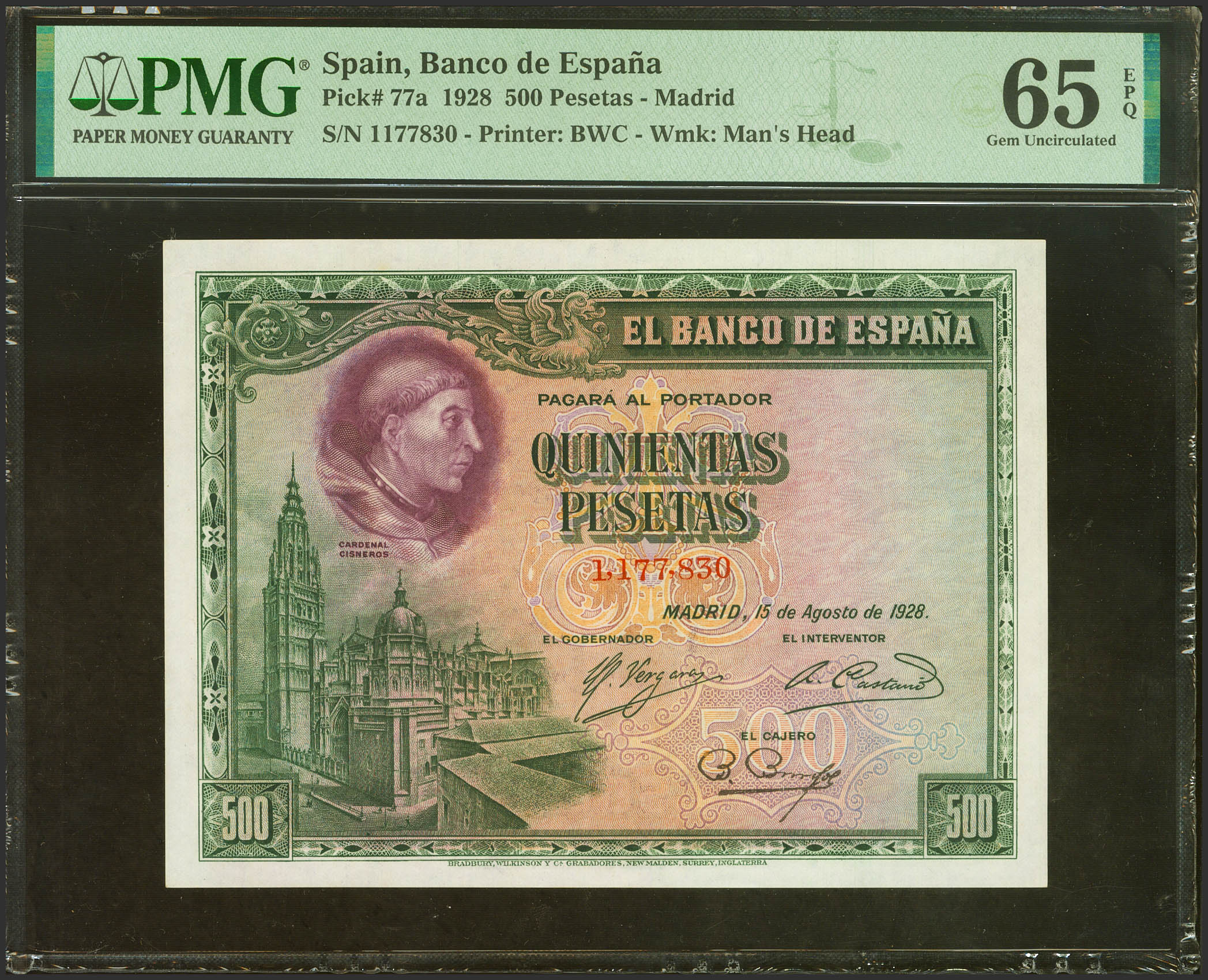 500 Pesetas. 15 de Agosto de 1928. Sin serie. (Edifil 2023: 356, Pick: 77a). Apresto original. SC. Encapsulado PMG65EPQ.