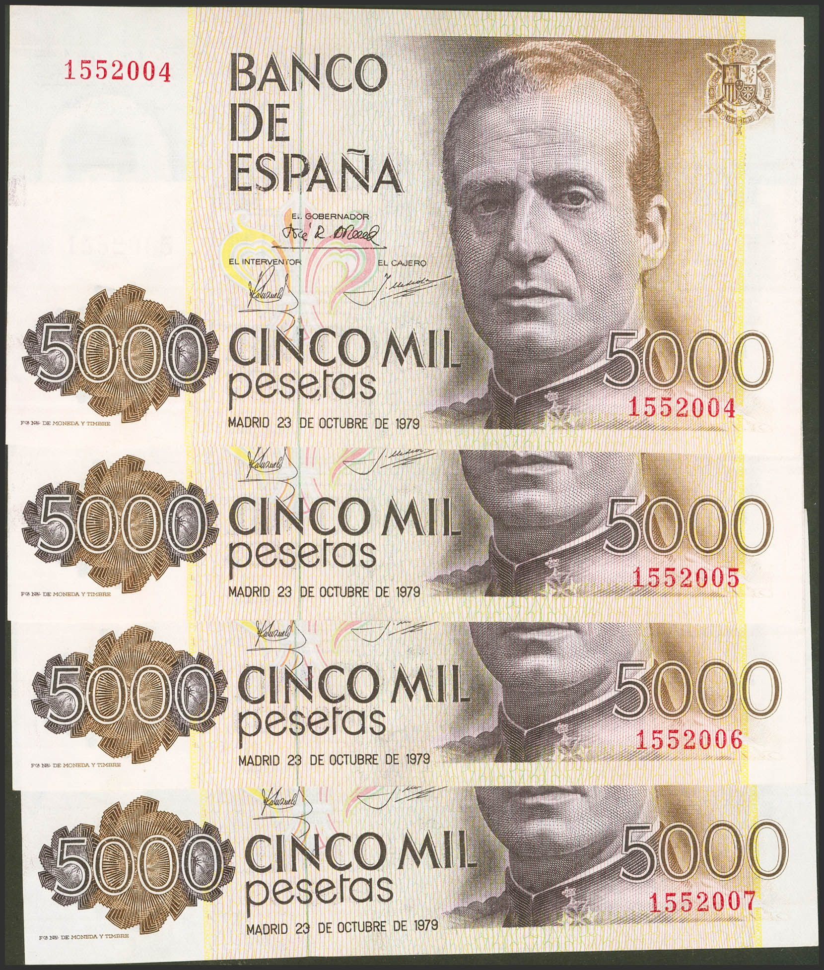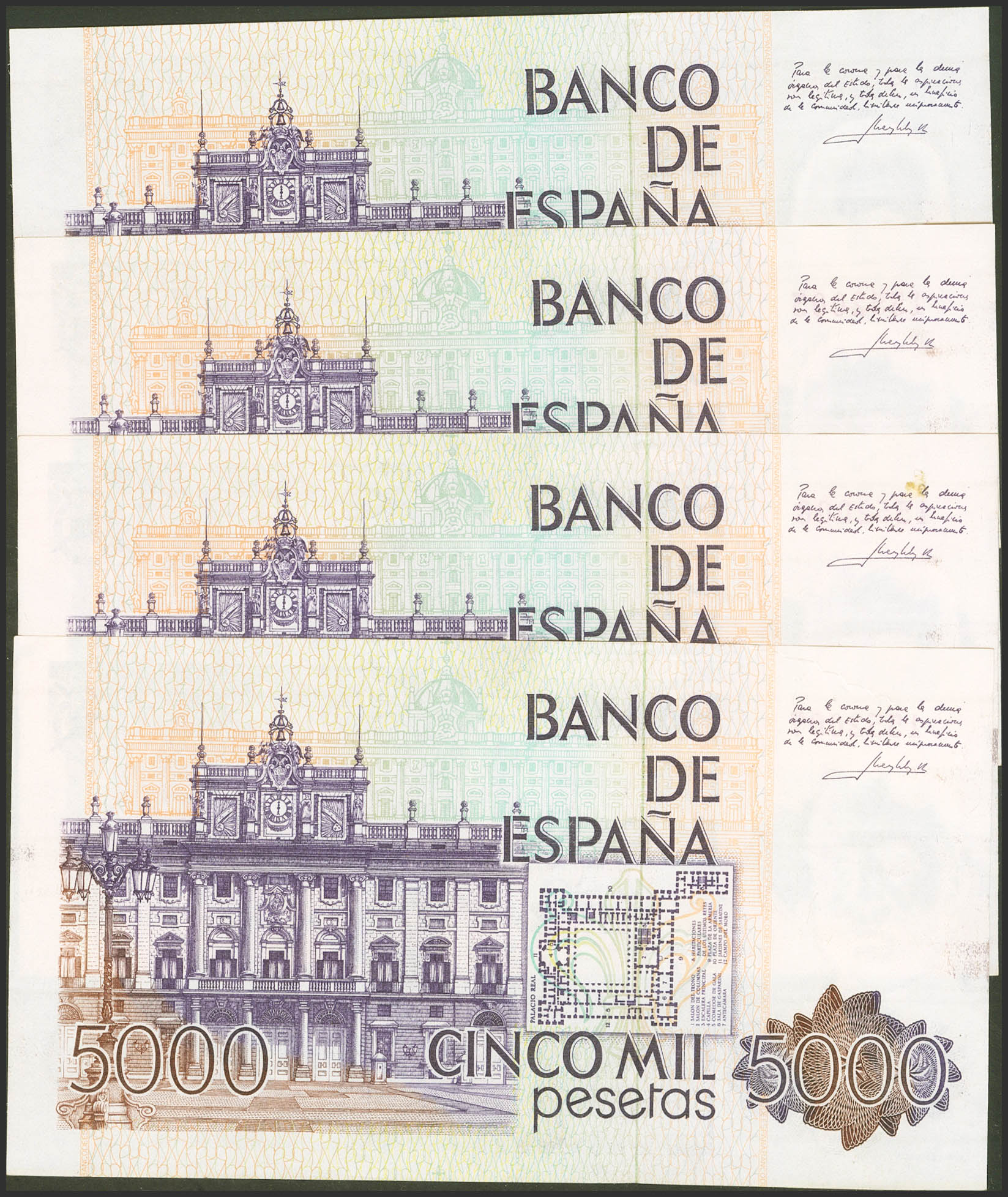 Conjunto de 4 billetes correlativos de de 5000 Pesetas emitidos el 23 de Diciembre de 1979, todos ellos sin serie (Edifil 2021: 478). Ondulaciones naturales del proceso de fabricación (este es el único motivo de "quitarle" el SC). EBC+++.