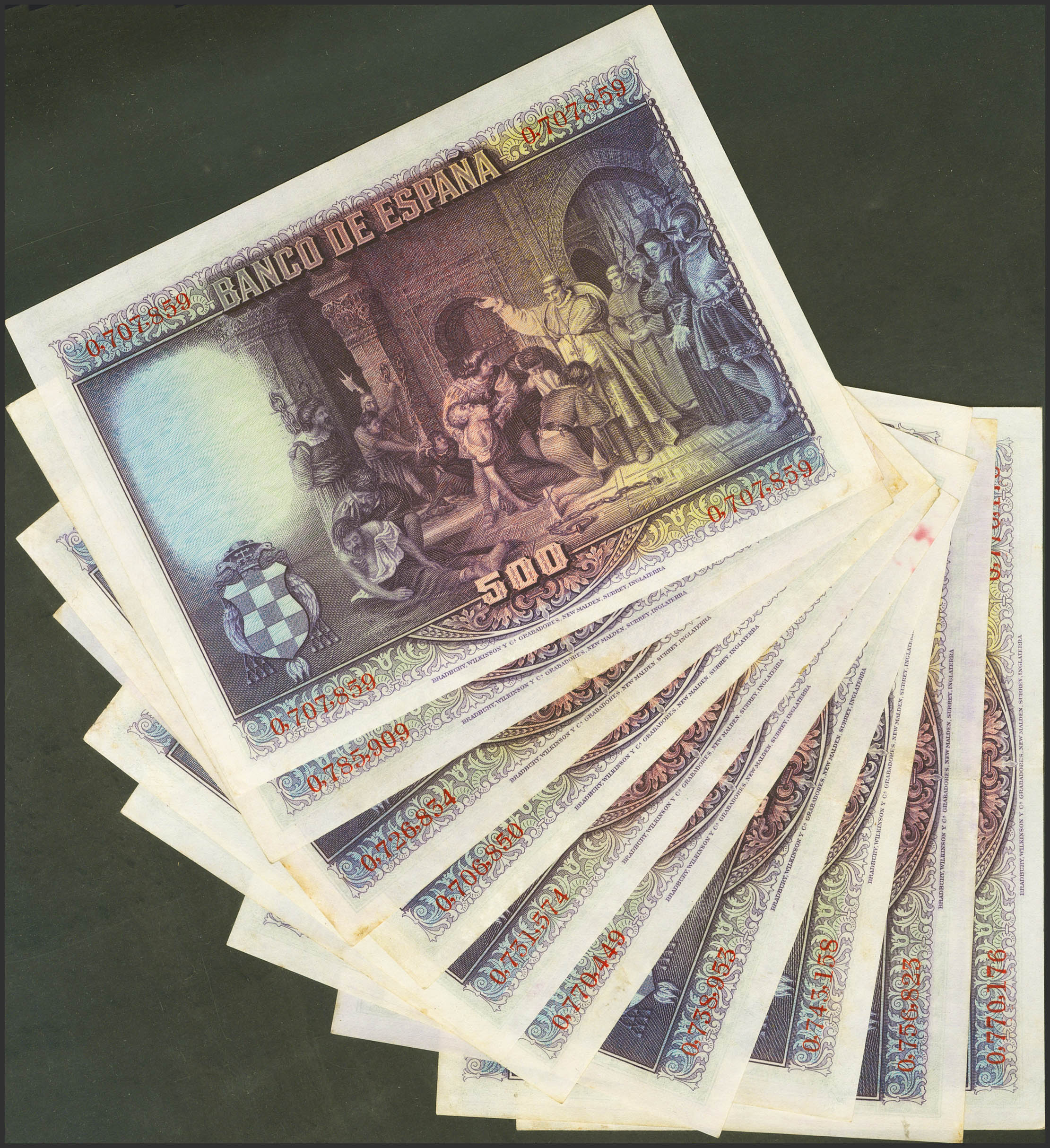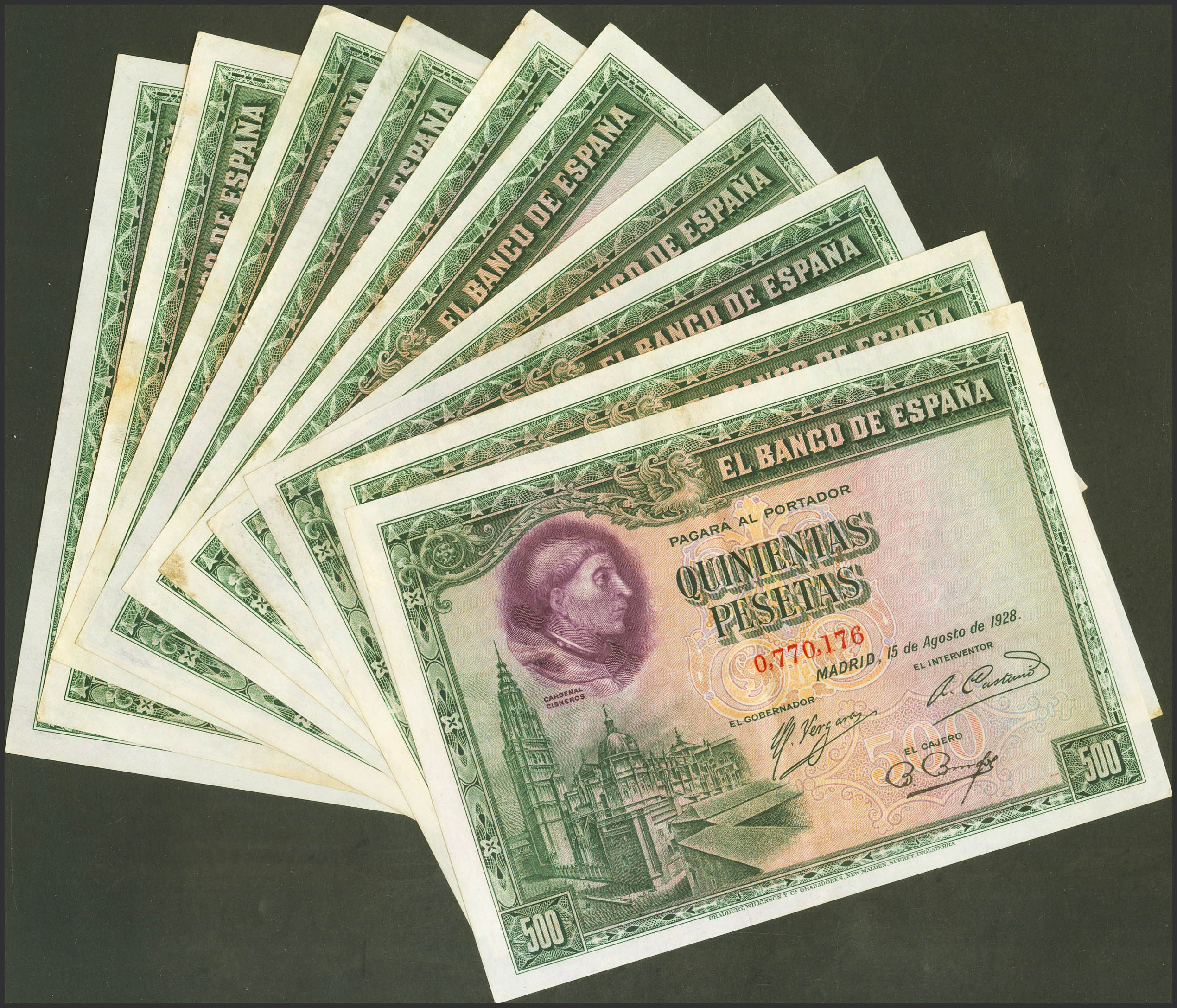 Precioso conjunto de 10 billetes de 500 Pesetas emitidos el 15 de Agosto de 1928, sin serie (Edifil 2021: 356), conservando gran parte de su apresto original. EBC.