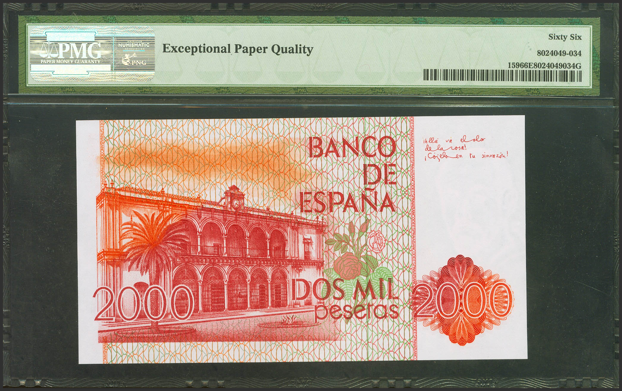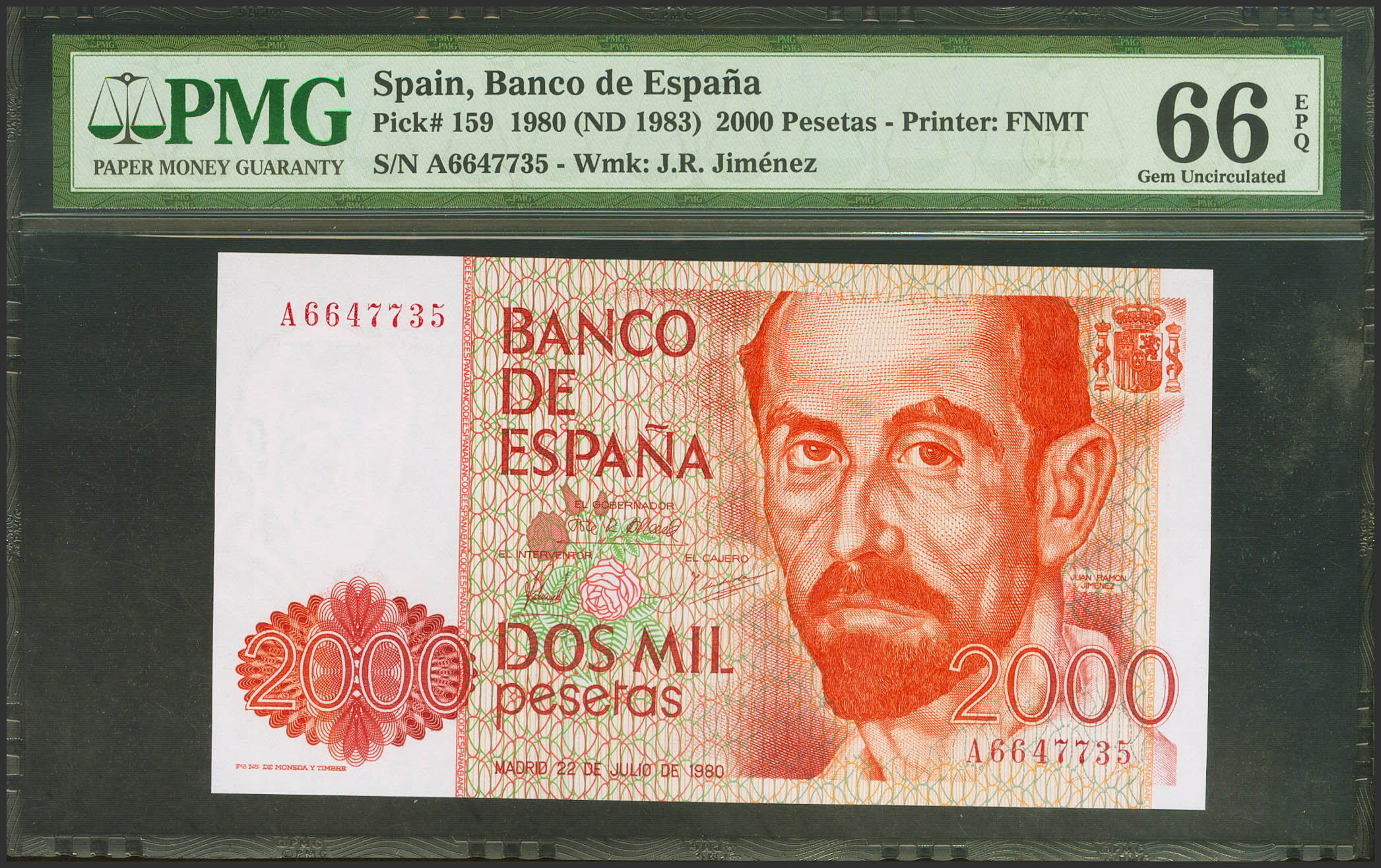 2000 Pesetas. 22 de Julio de 1980. Serie A. (Edifil 2023: 479a, Pick: 159). Inusual en esta calidad. SC. Encapsulado PMG66EPQ.