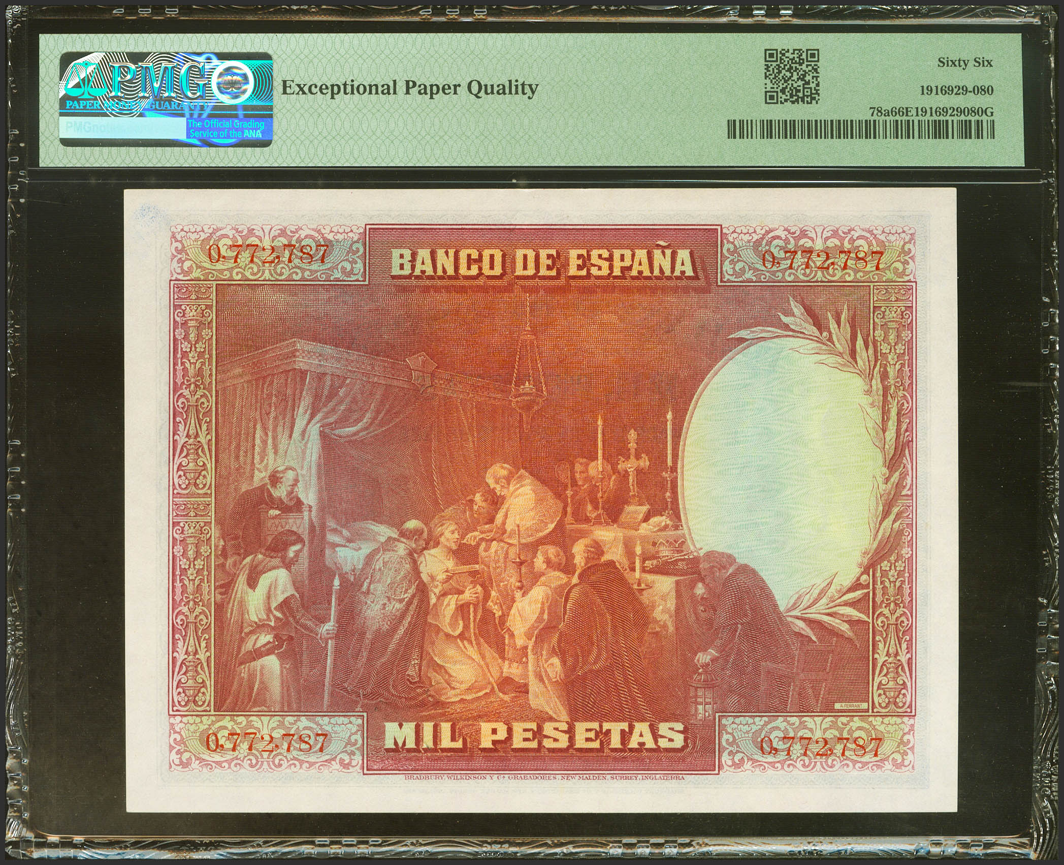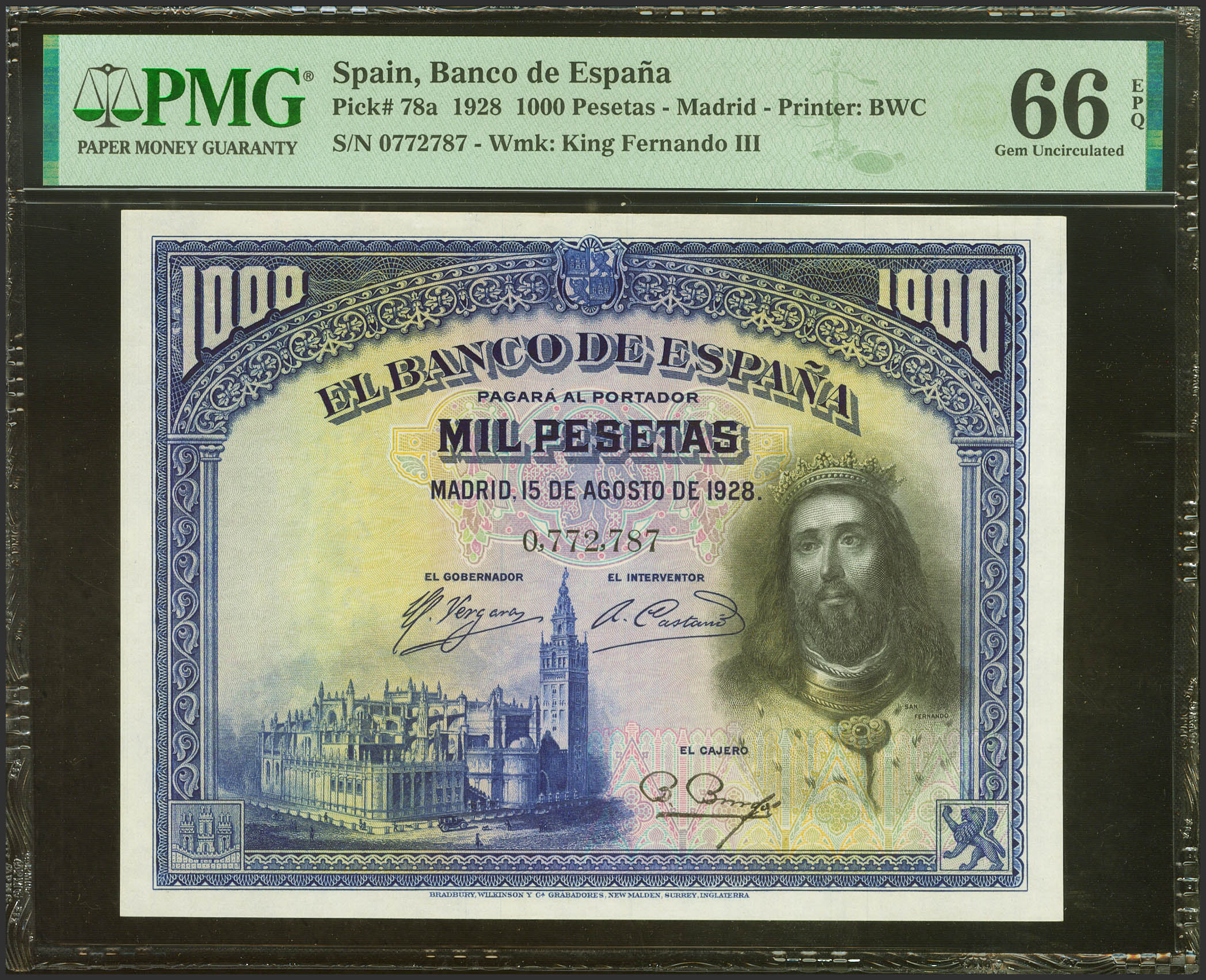 1000 Pesetas. 15 de Agosto de 1928. Sin serie. (Edifil 2023: 357, Pick: 78a). Inusual en esta excepcional calidad, apresto original. SC. Encapsulado PMG66EPQ.