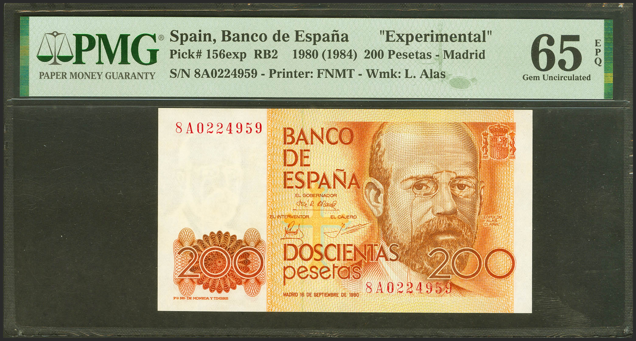 200 Pesetas. 16 de Septiembre de 1980. Serie especial 8A. (Edifil 2021: 480c, Pick: 156exp). SC. Encapsulado PMG65EPQ.