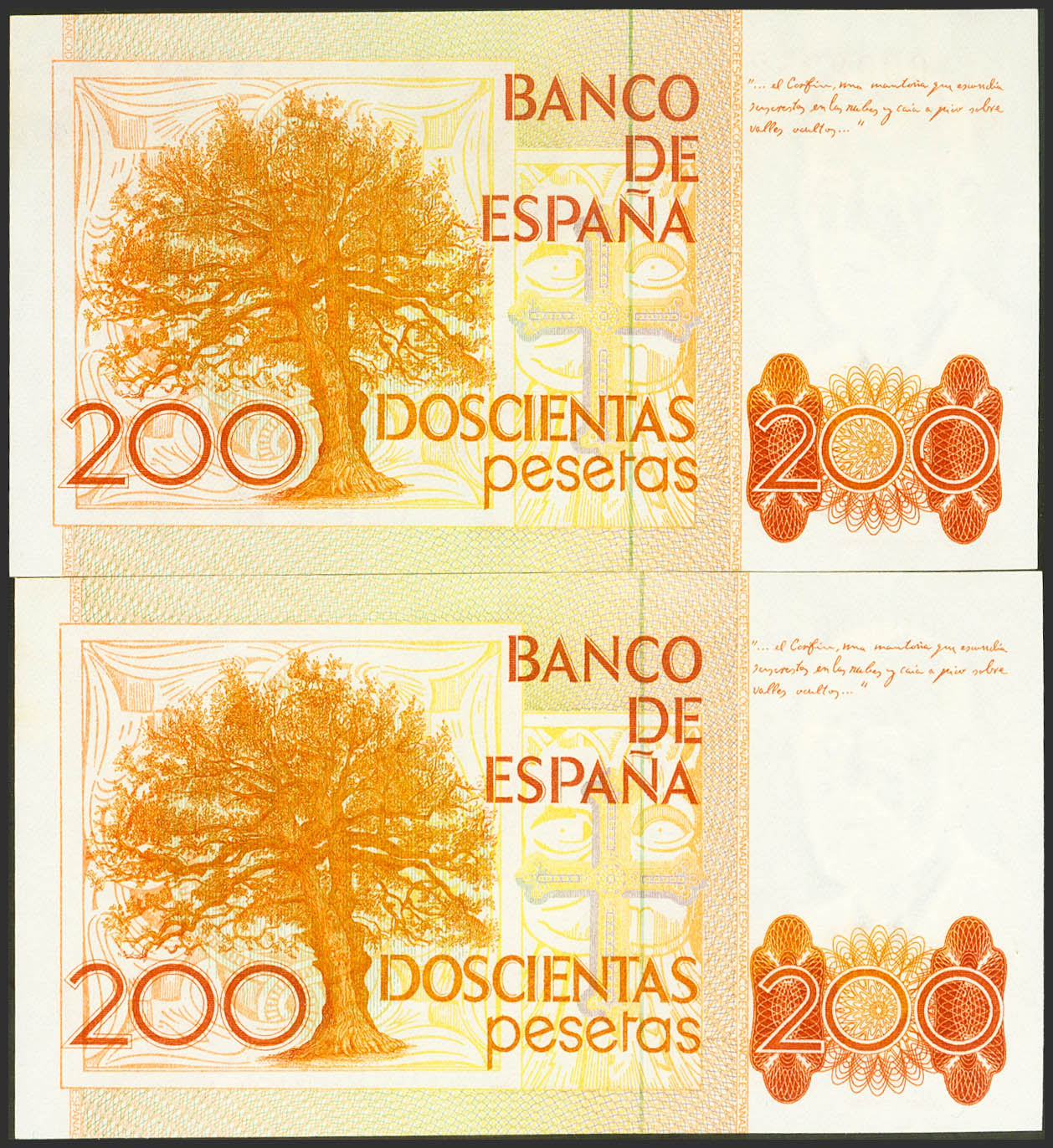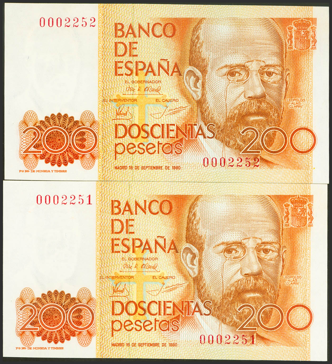 200 Pesetas. 16 de Septiembre de 1980. Pareja correlativa. Sin serie y numeración muy baja. (Edifil 2023: 480). SC.