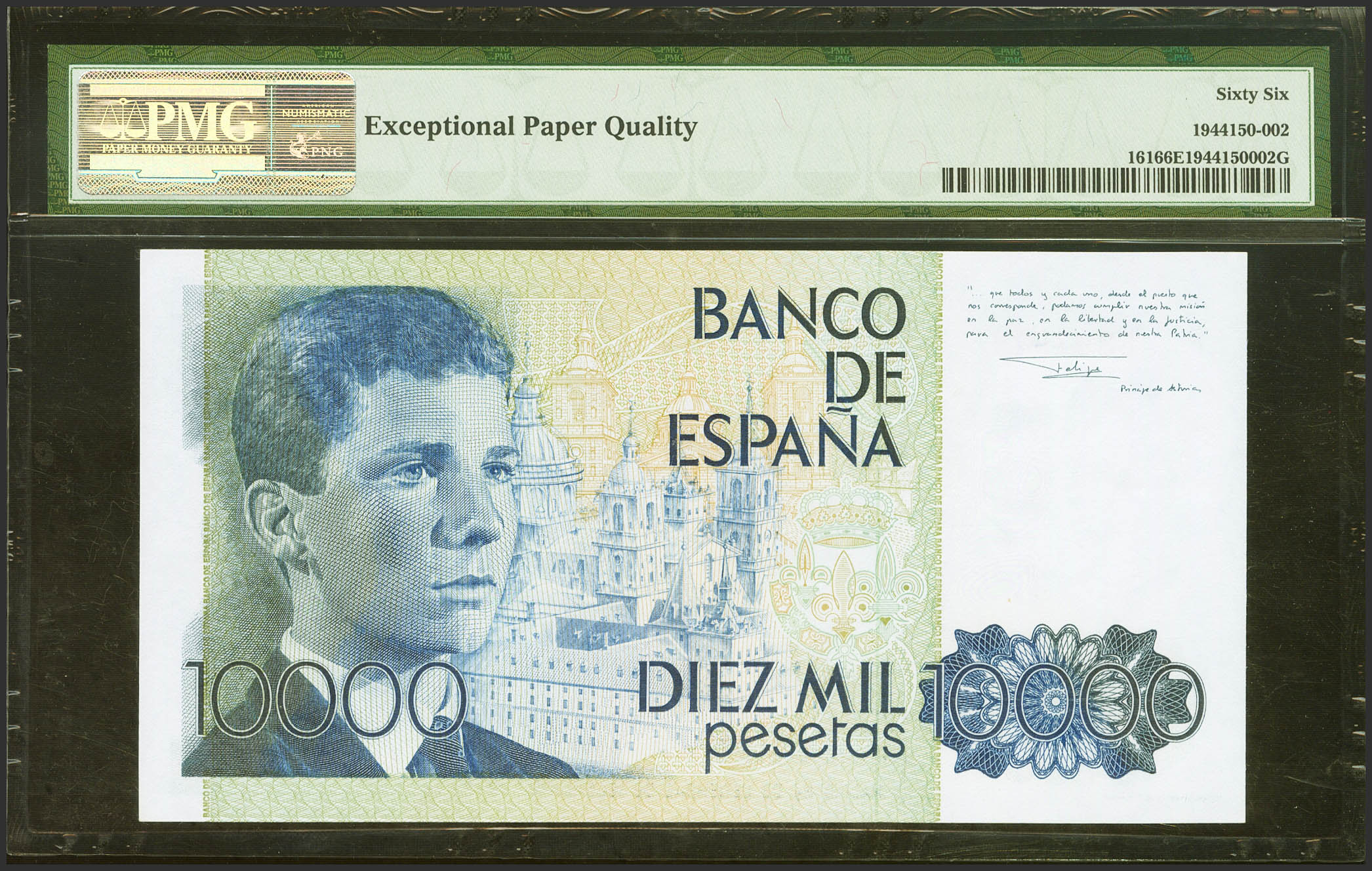 10000 Pesetas. 24 de Septiembre de 1985. Sin serie. (Edifil 2021: 481, Pick: 161). Inusual en esta excepcional calidad. SC. Encapsulado PMG66EPQ.