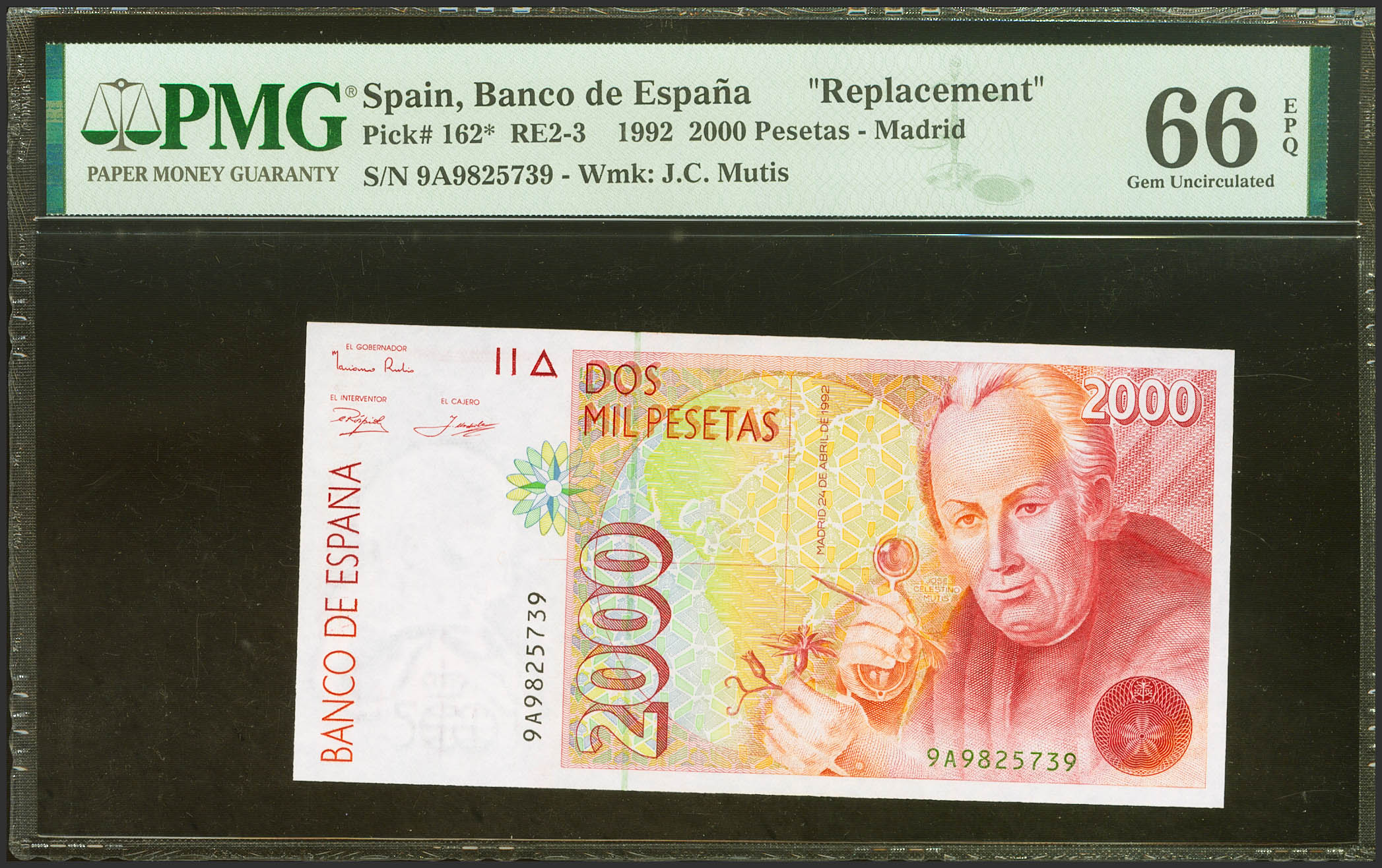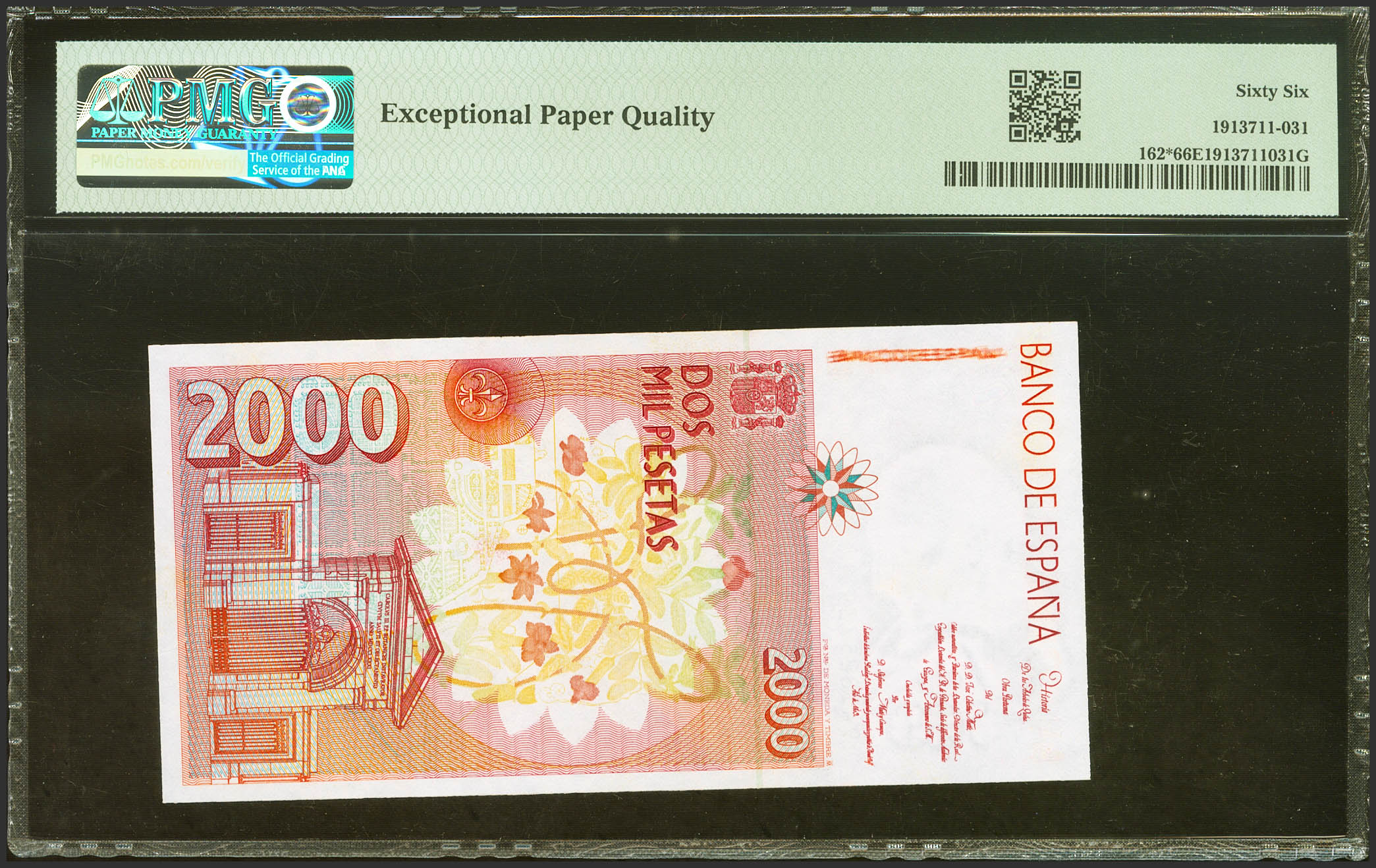 2000 Pesetas. 24 de Abril de 1992. Serie especial 9A. (Edifil 2021: 482b, Pick: 162*). Muy rara serie, especialmente en esta excepcional calidad. SC. Encapsulado PMG66EPQ.
