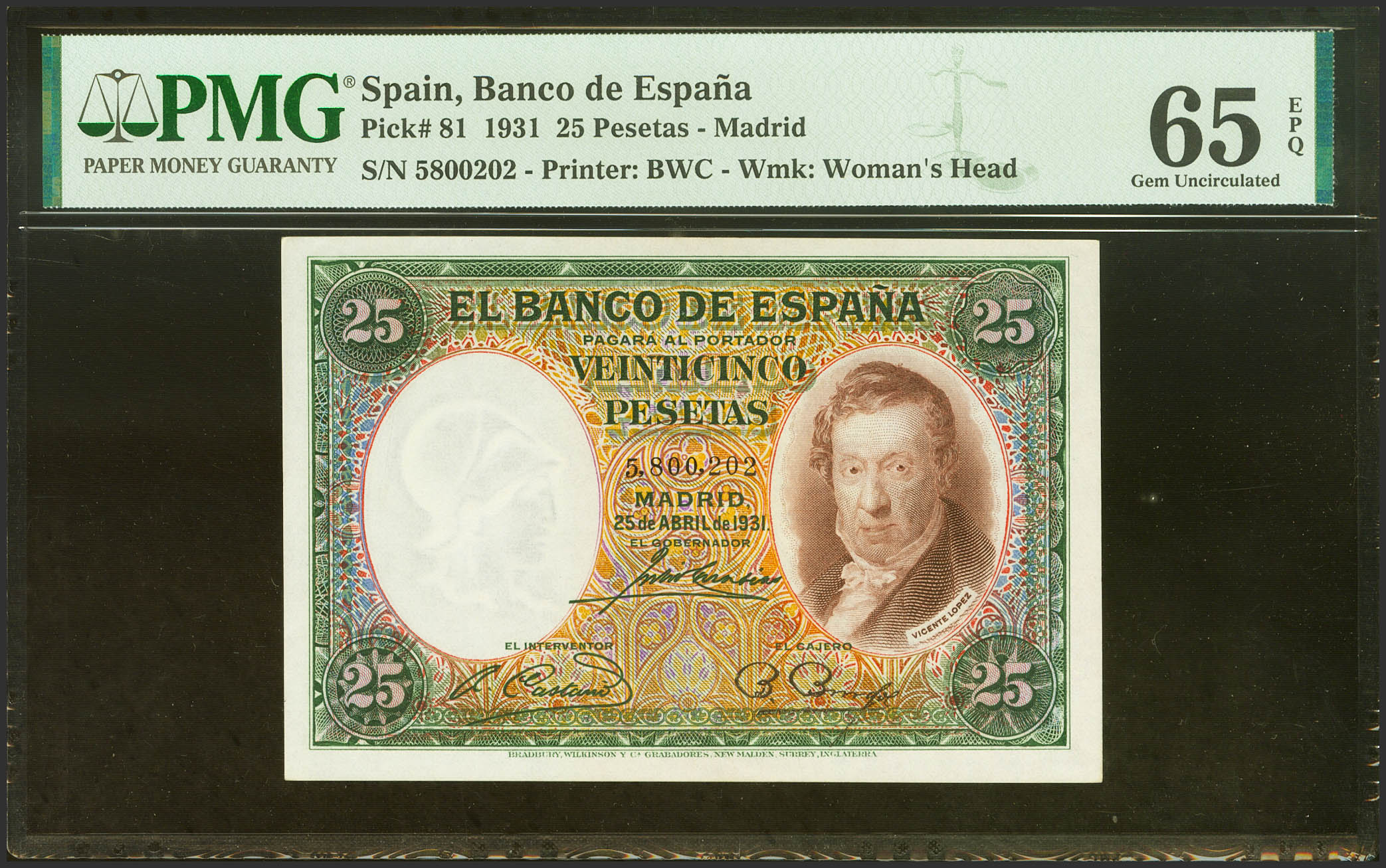 25 Pesetas. 25 de Abril de 1931. Sin serie. (Edifil 2023: 358, Pick: 81). Inusual en esta excepcional calidad, apresto original. SC. Encapsulado PMG65EPQ.