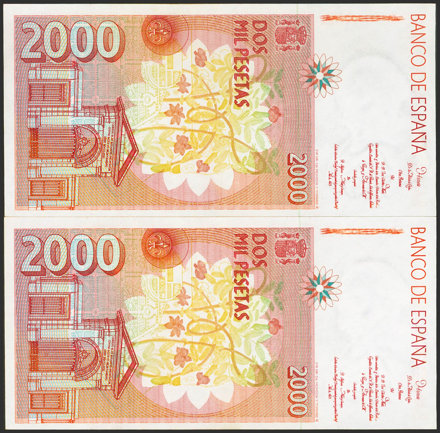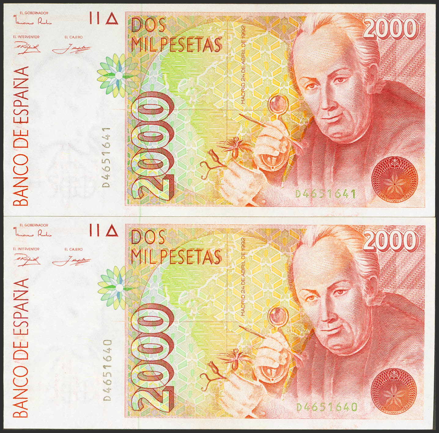2000 Pesetas. 24 de Abril de 1992. Pareja correlativa. Serie D. (Edifil 2023: 482a). SC.