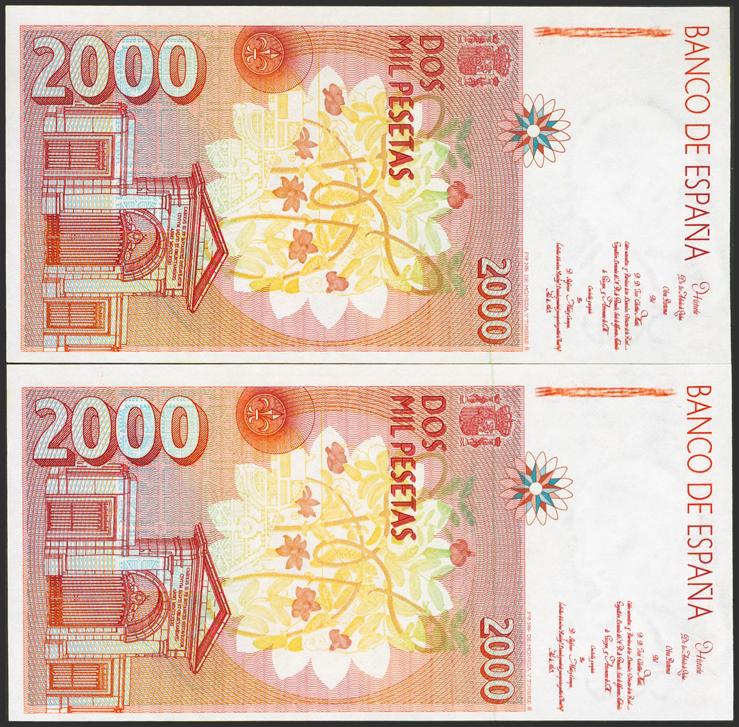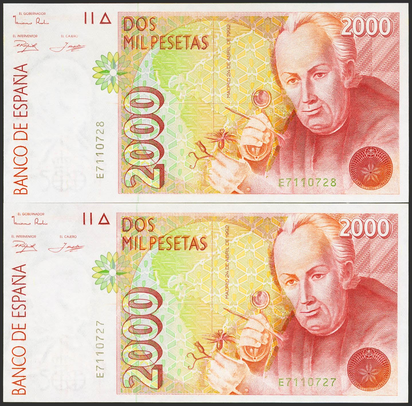 2000 Pesetas. 24 de Abril de 1992. Pareja correlativa. Serie E. (Edifil 2023: 482a). SC.