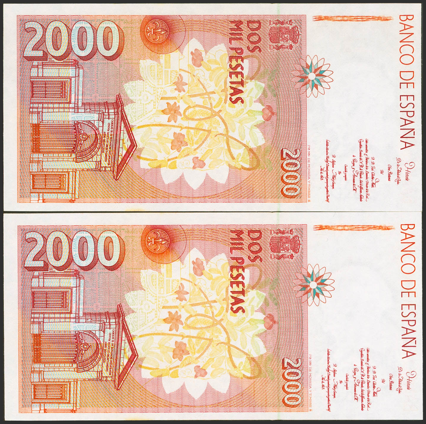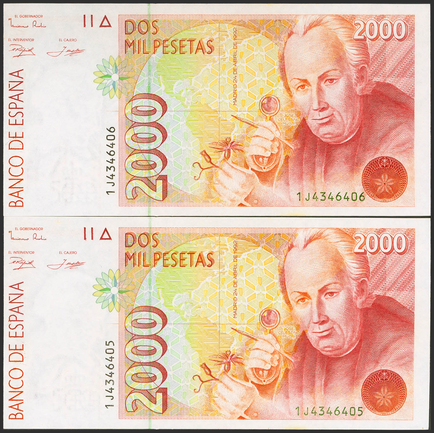 2000 Pesetas. 24 de Abril de 1992. Pareja correlativa. Serie 1J. (Edifil 2023: 482a). SC--.