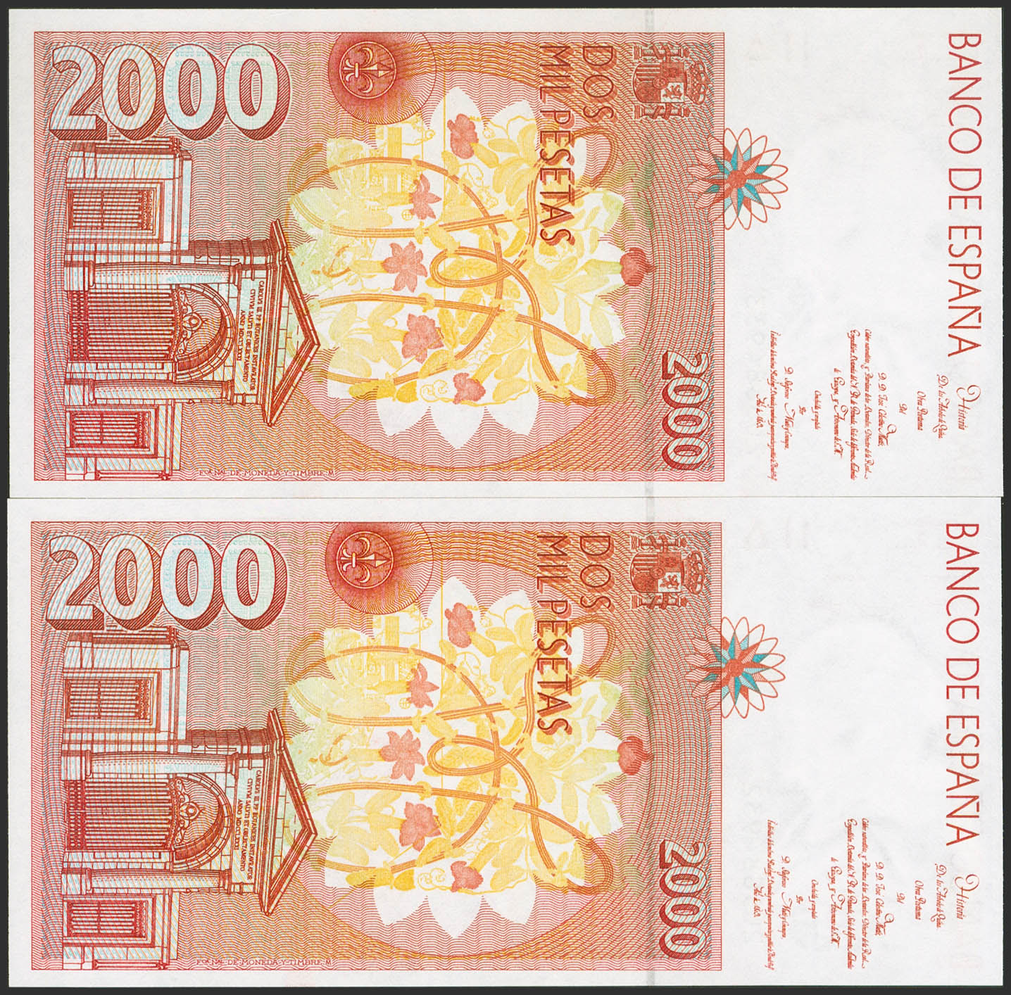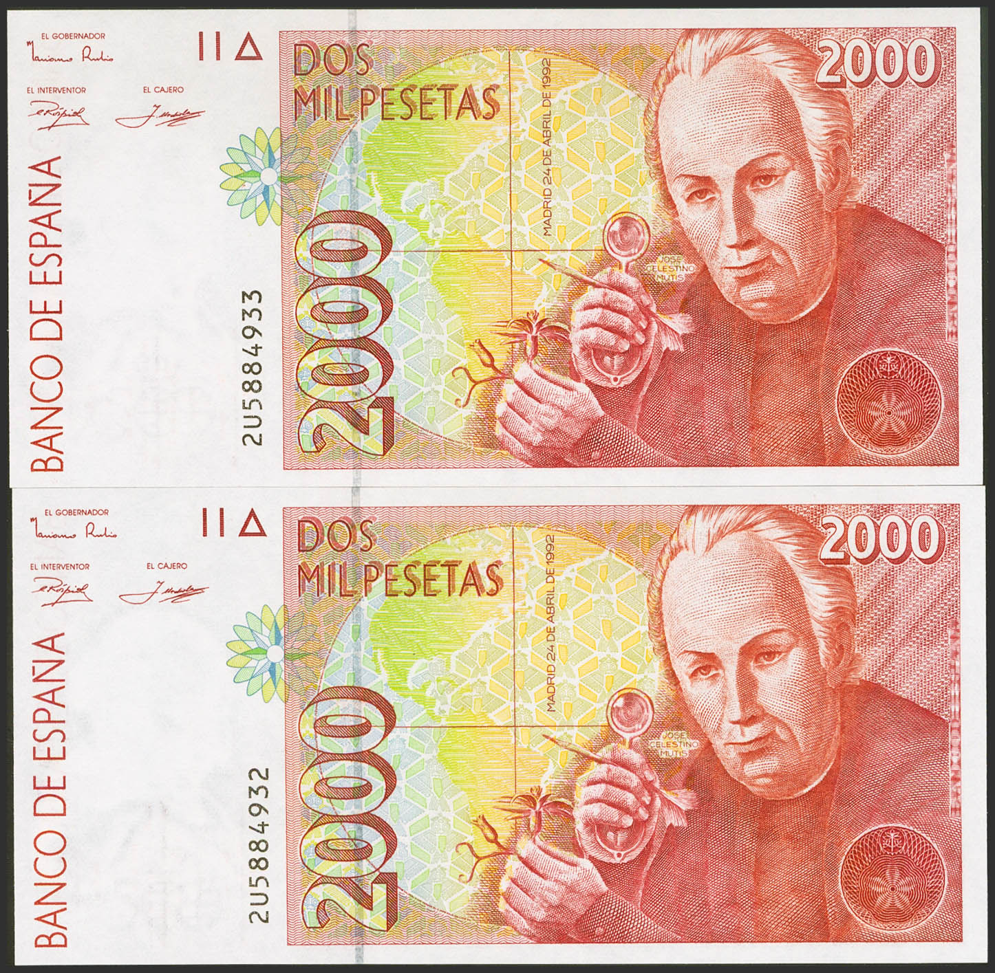 2000 Pesetas. 24 de Abril de 1992. Pareja correlativa. Serie 2U. (Edifil 2023: 482Aa). SC