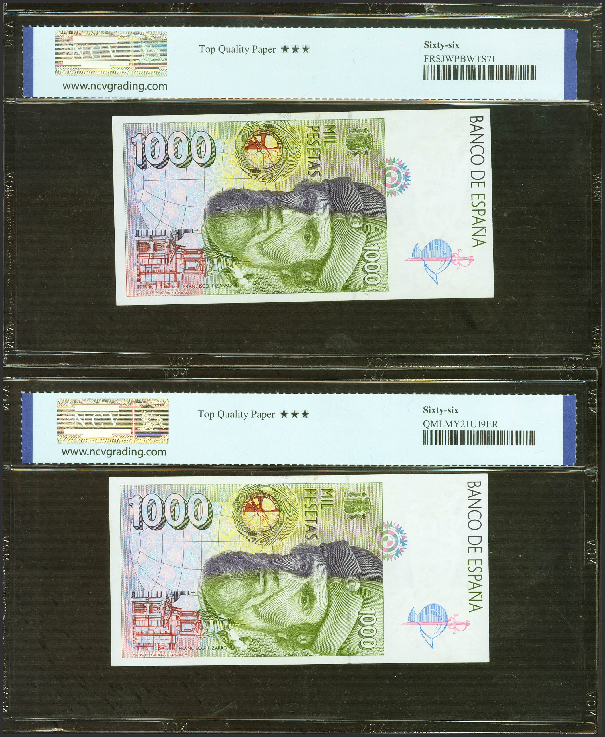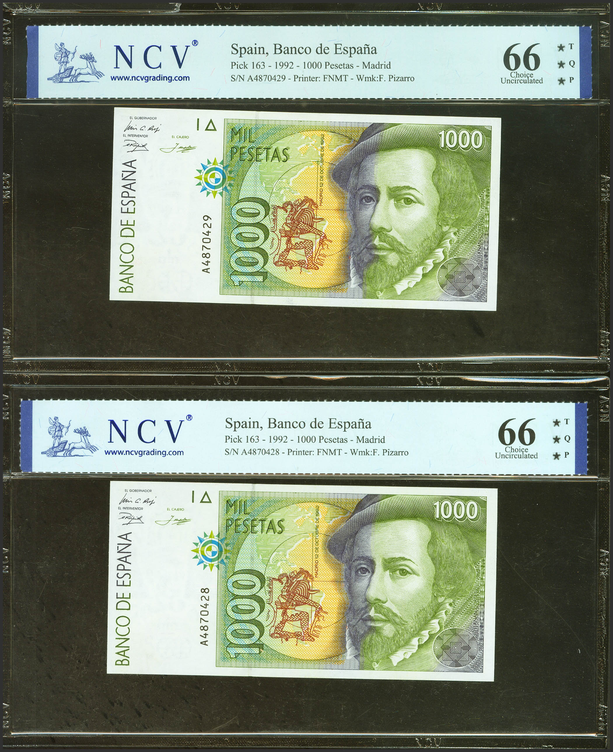 1000 Pesetas. 12 de Octubre de 1992. Pareja correlativa. Serie A. (Edifil 2023: 483a, Pick: 163). SC. Encapsulados NCV66TQP.