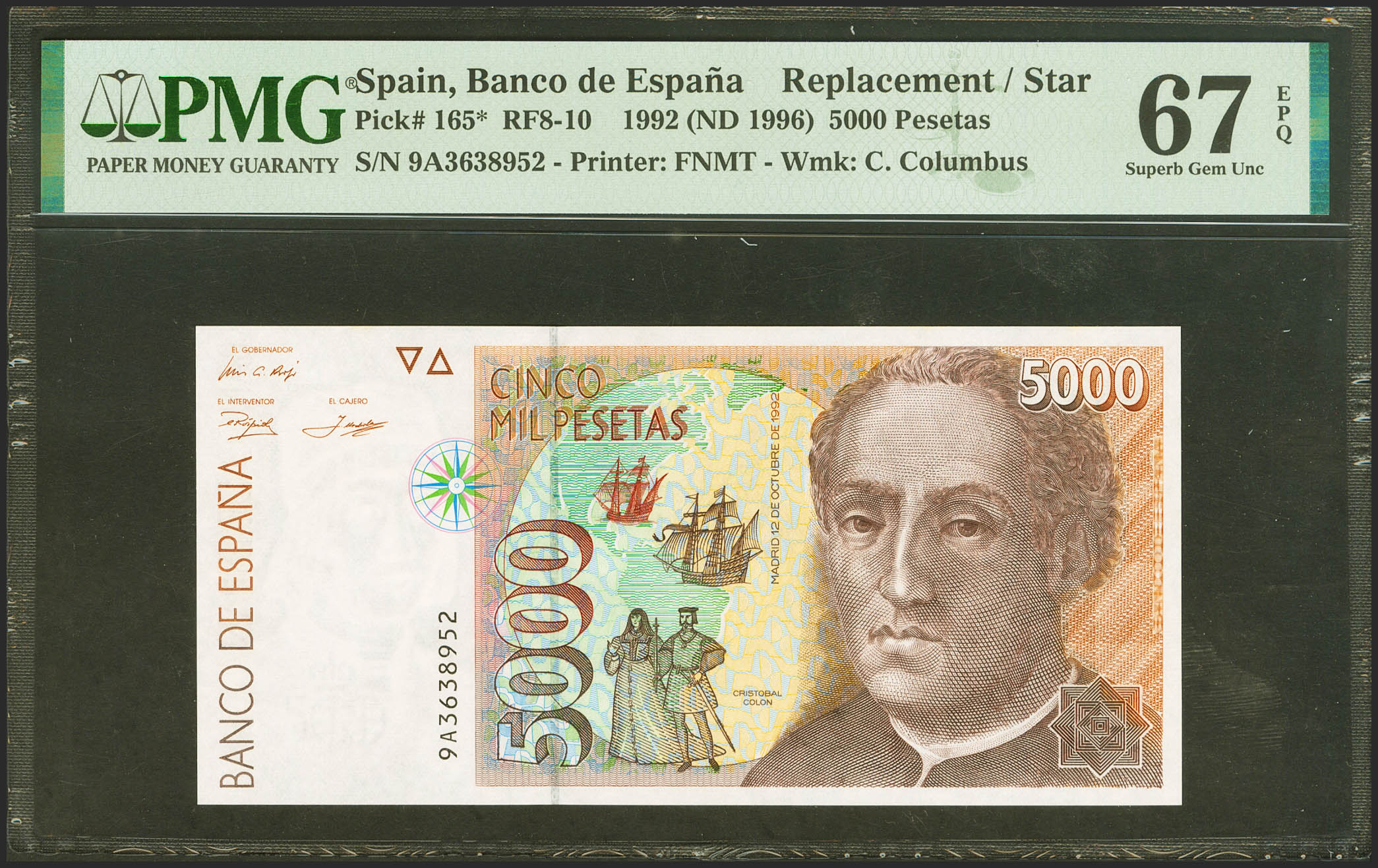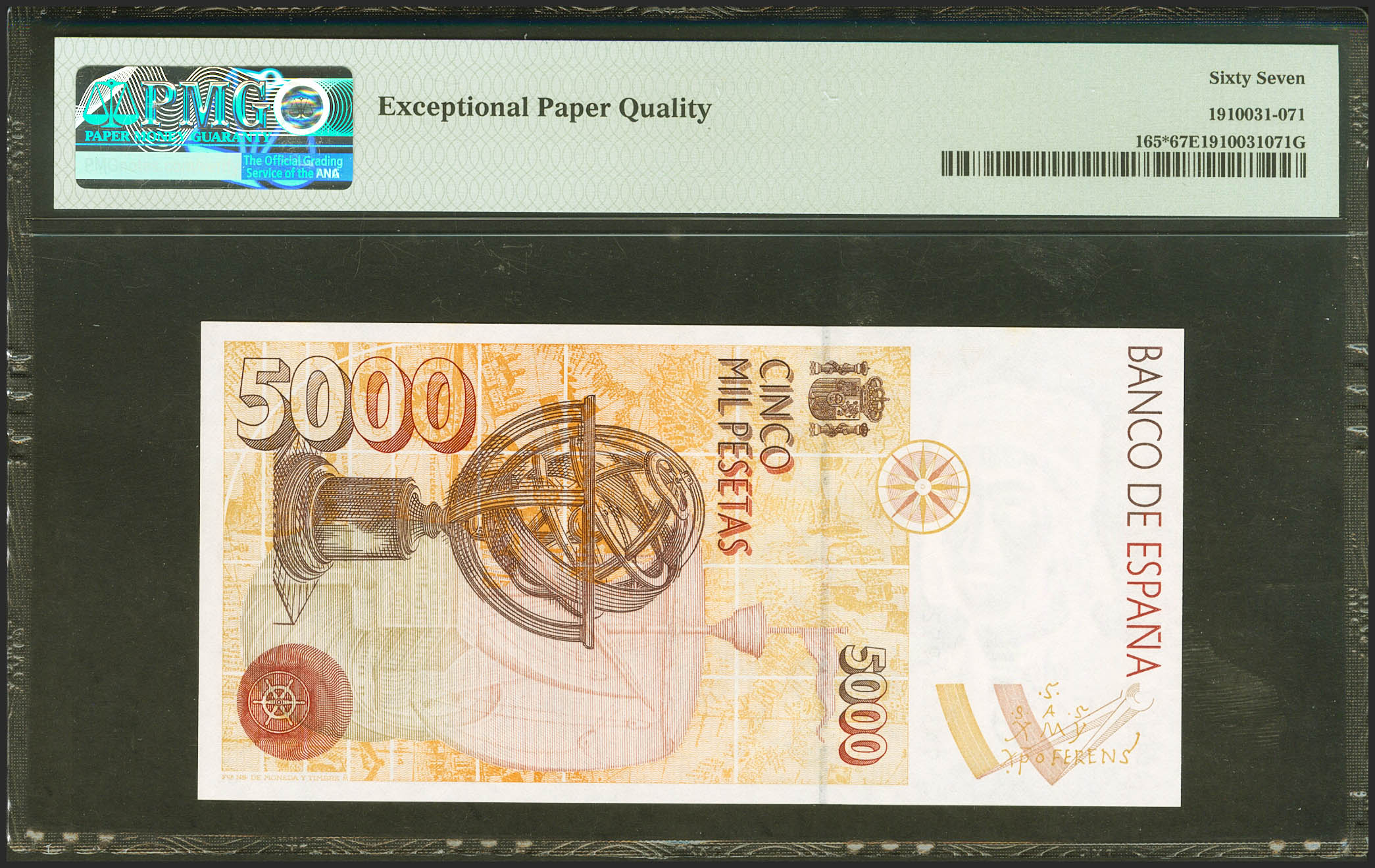 5000 Pesetas. 12 de Octubre de 1992. Serie especial 9A. (Edifil 2021: 484b, Pick: 165*). Inusual en esta excepcional calidad. SC. Encapsulado PMG67EPQ.