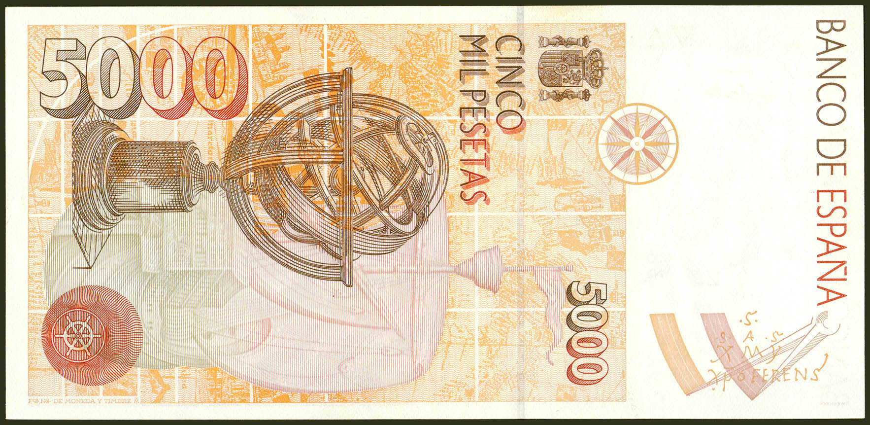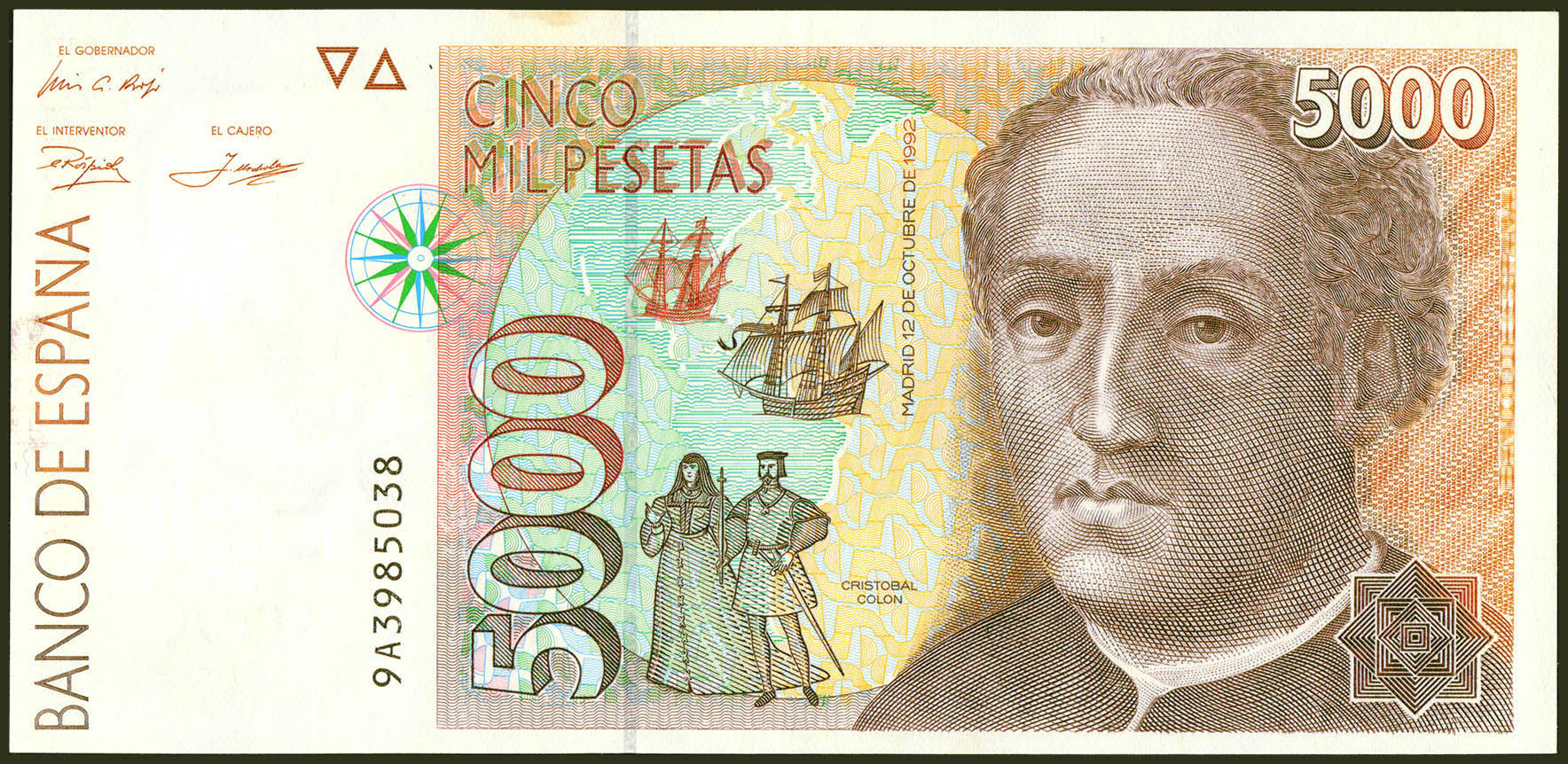 5000 Pesetas. 12 de Octubre de 1992. Serie especial 9A. (Edifil 2021: 484b). Manchita del tiempo. EBC+.