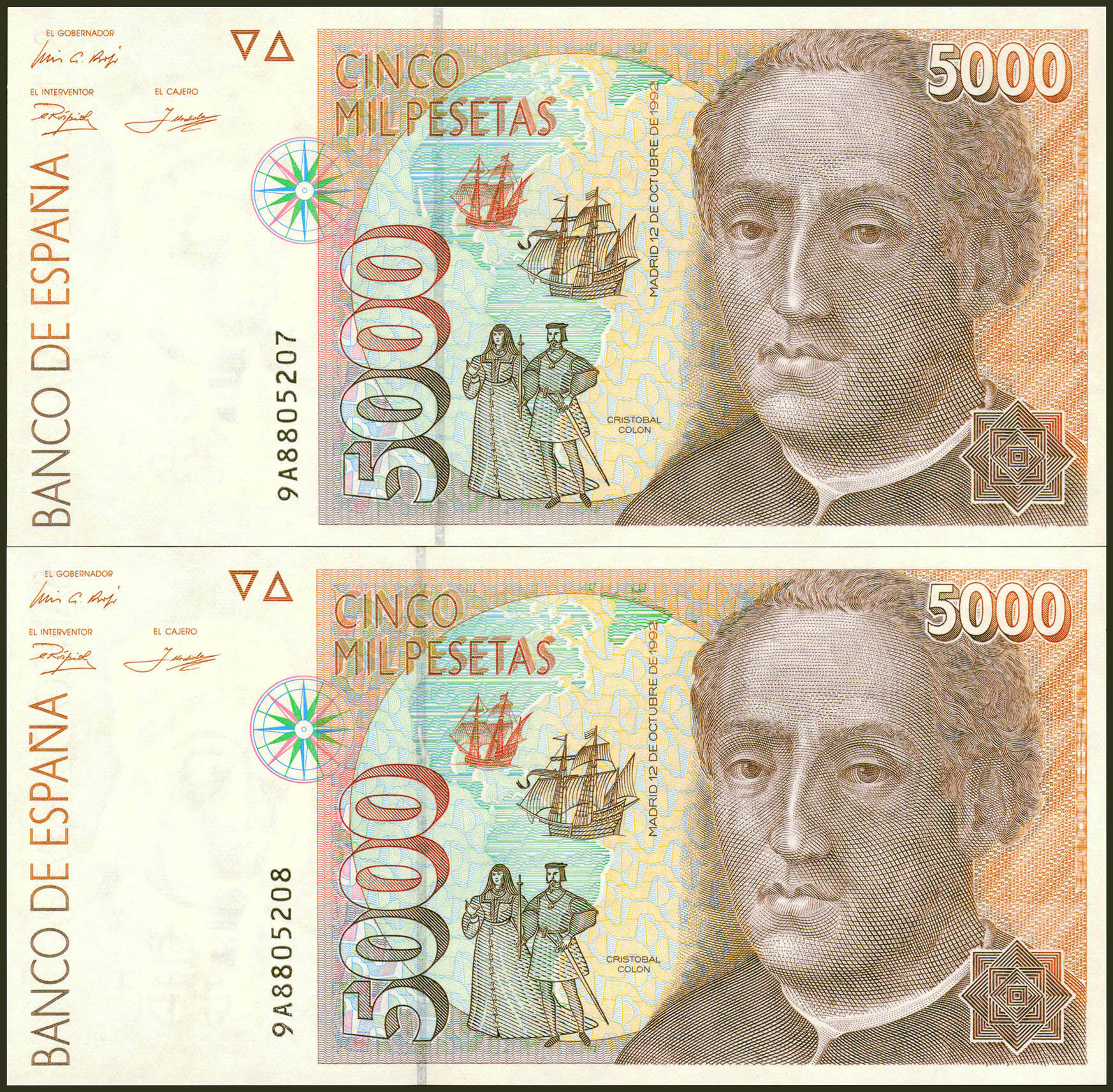 5000 Pesetas. 12 de Octubre de 1992. Pareja correlativa. Serie especial 9A. (Edifil 2021: 484b). SC-.