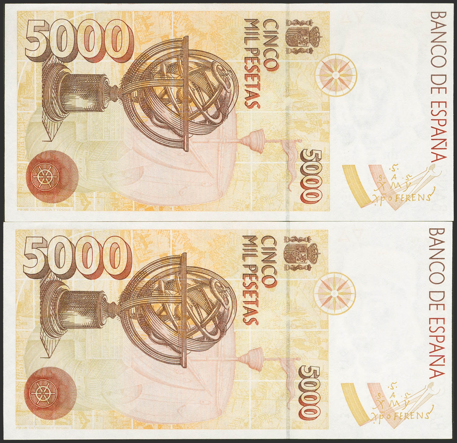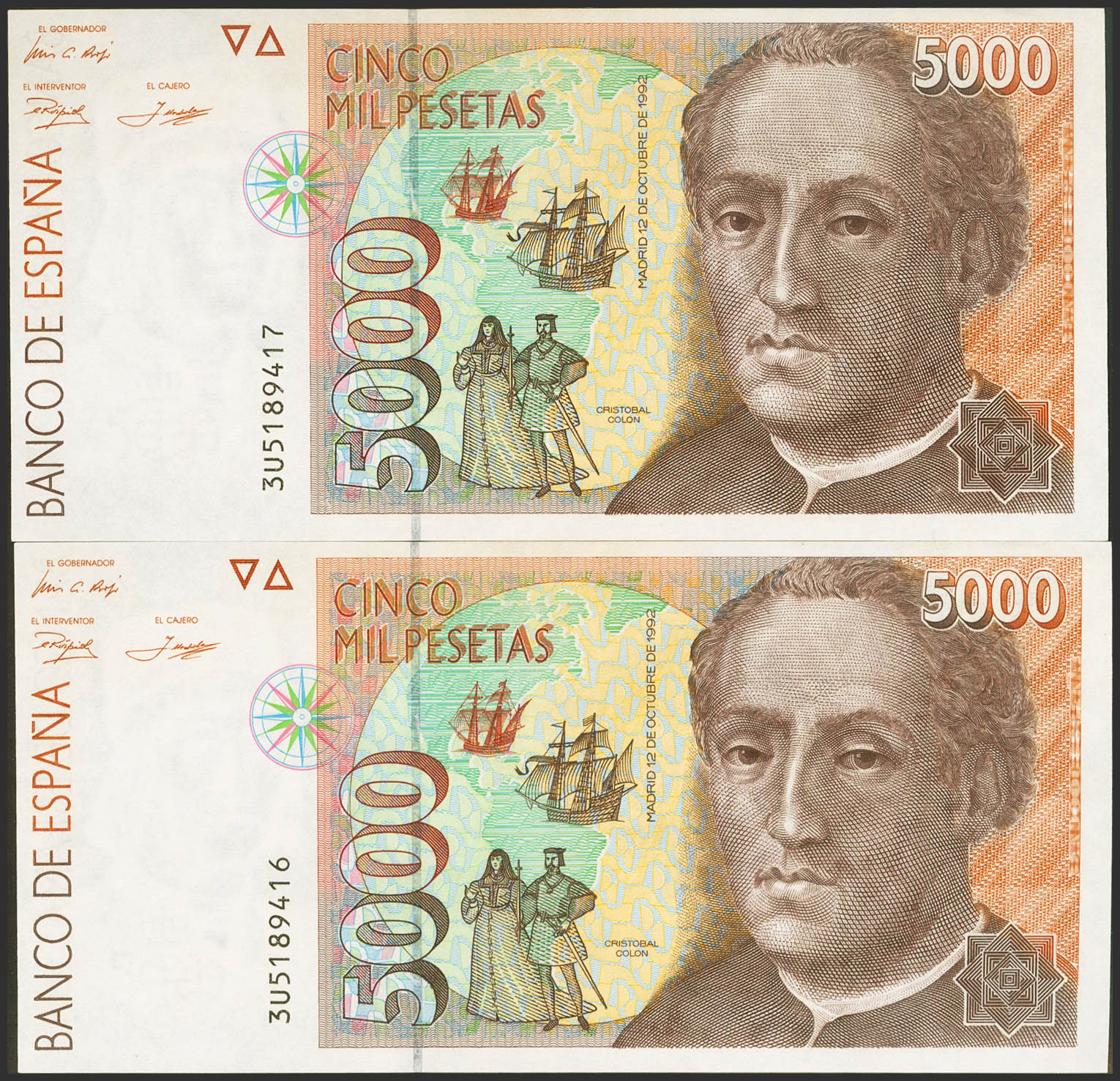 5000 Pesetas. 12 de Octubre de 1992. Pareja correlativa. Serie 3U. (Edifil 2023: 484a). SC.
