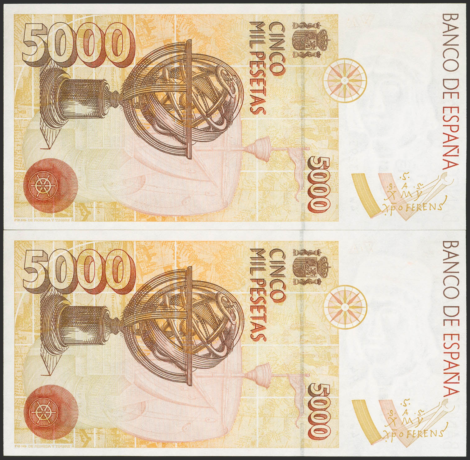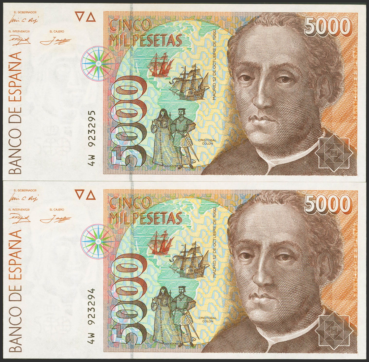 5000 Pesetas. 12 de Octubre de 1992. Pareja correlativa. Serie 4W. (Edifil 2023: 484a). SC.