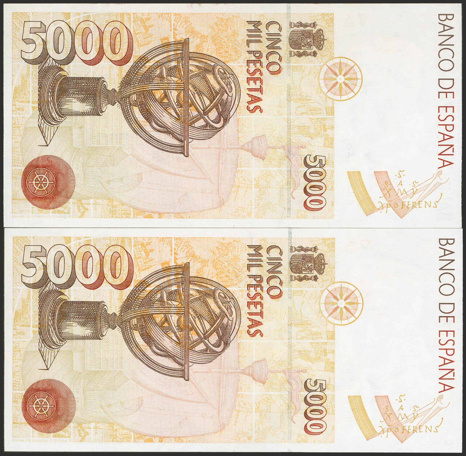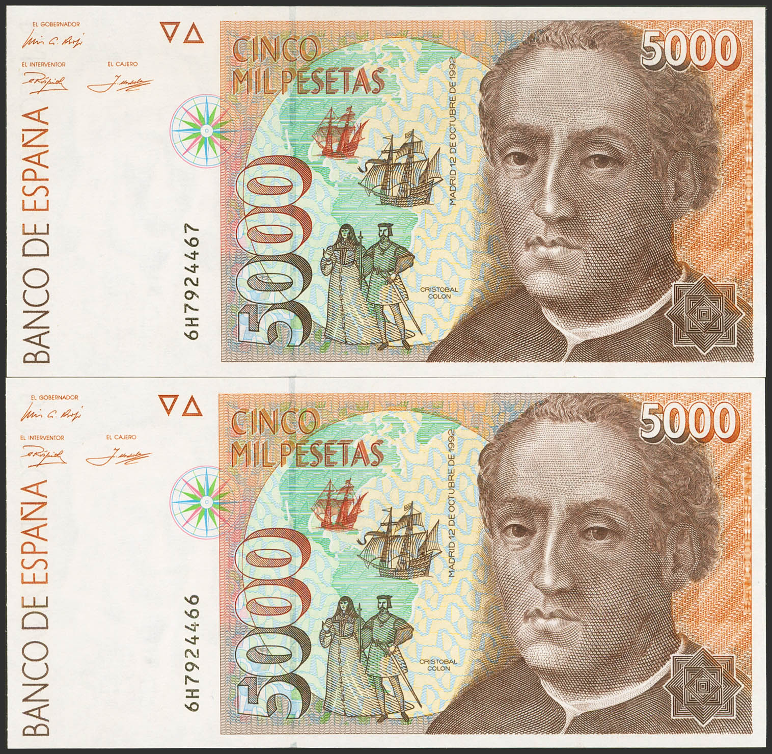 5000 Pesetas. 12 de Octubre de 1992. Pareja correlativa. Serie 6H. (Edifil 2023: 484a). SC.
