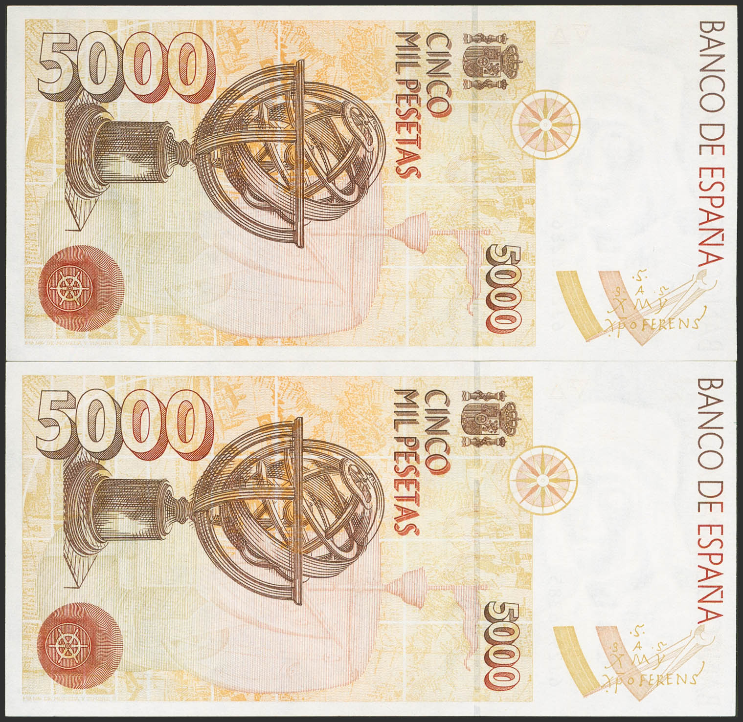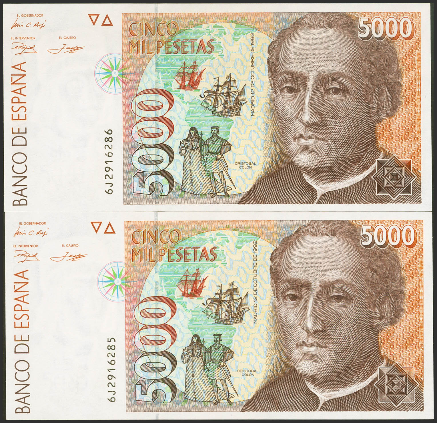 5000 Pesetas. 12 de Octubre de 1992. Pareja correlativa. Serie 6J. (Edifil 2023: 484a). SC.